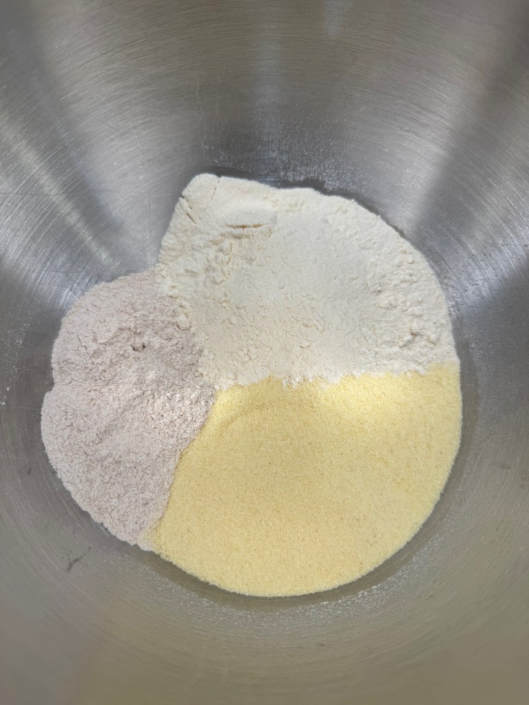 - Combine flours and onion powder in the bowl of a stand mixer, fitted with the dough hook