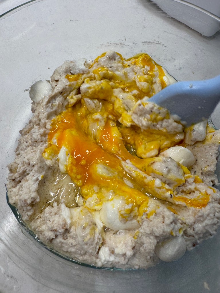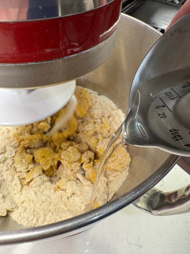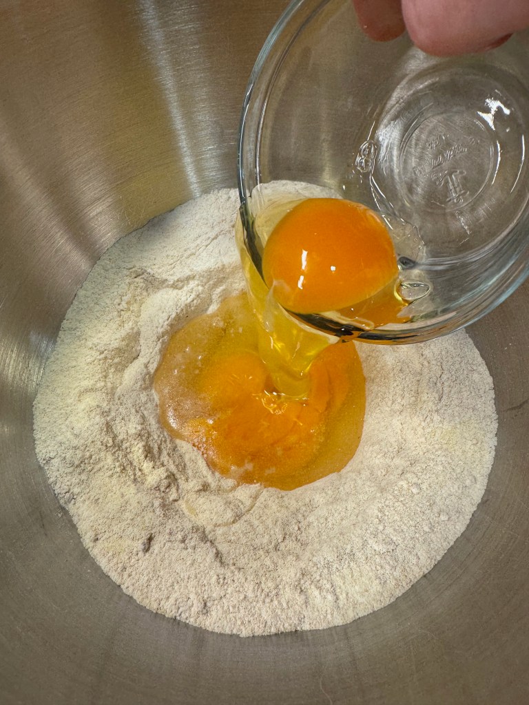 - Make a well in the center of the flour mixture and add eggs. Knead with the dough hook on speed 3 until dough starts to come together (it will be dry). Drizzle in water, a little at a time, until all flour is incorporated and dough is gathered up on the hook. This may take extra water.