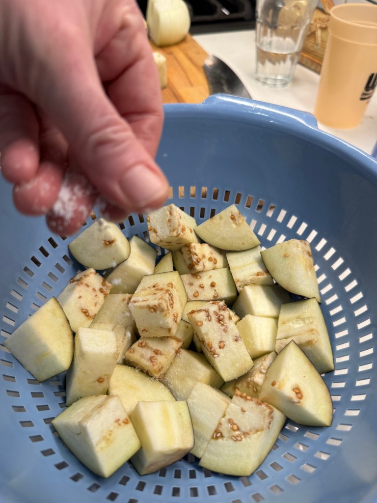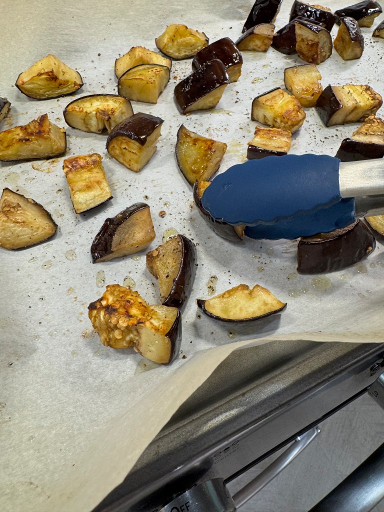 - Heat oven to 450° F, with rack in center position. Prepare two baking sheets by lining with parchment paper. Place eggplant cubes in a colander and toss gently with 1/2 tsp. salt. Let it rest half an hour, then gently rinse and pat dry before proceeding. Toss with a tablespoon of olive oil on one of the baking sheets and season with pepper only (they will have plenty of salty flavor from the prep stage).