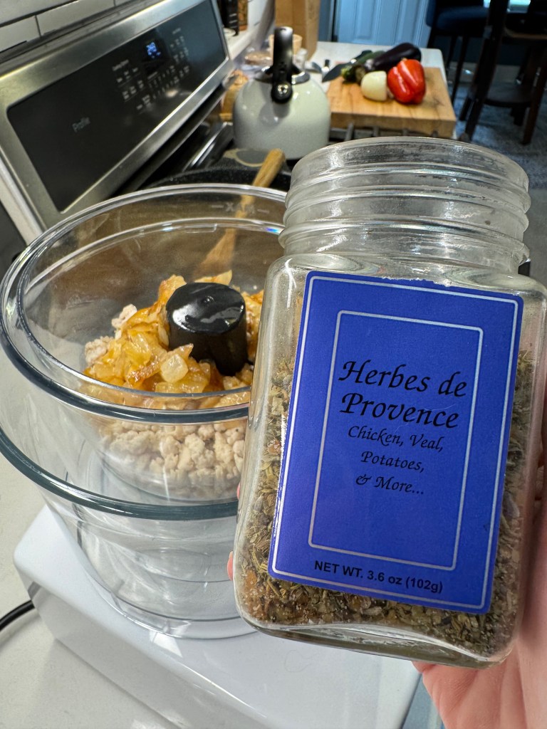 - Add meat mixture and caramelized onions to the bowl of a food processor. Add Herbs de Provence and lemon zest. Pulse a few times until the meat is ground to a fine texture and onions are no longer visible in whole.