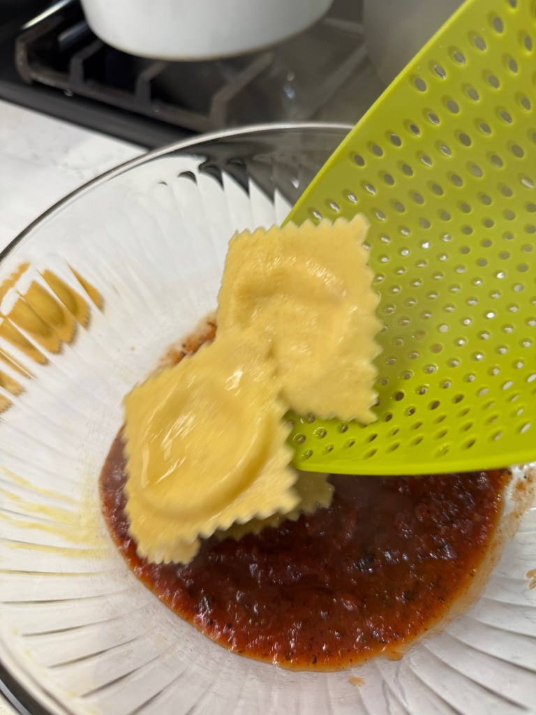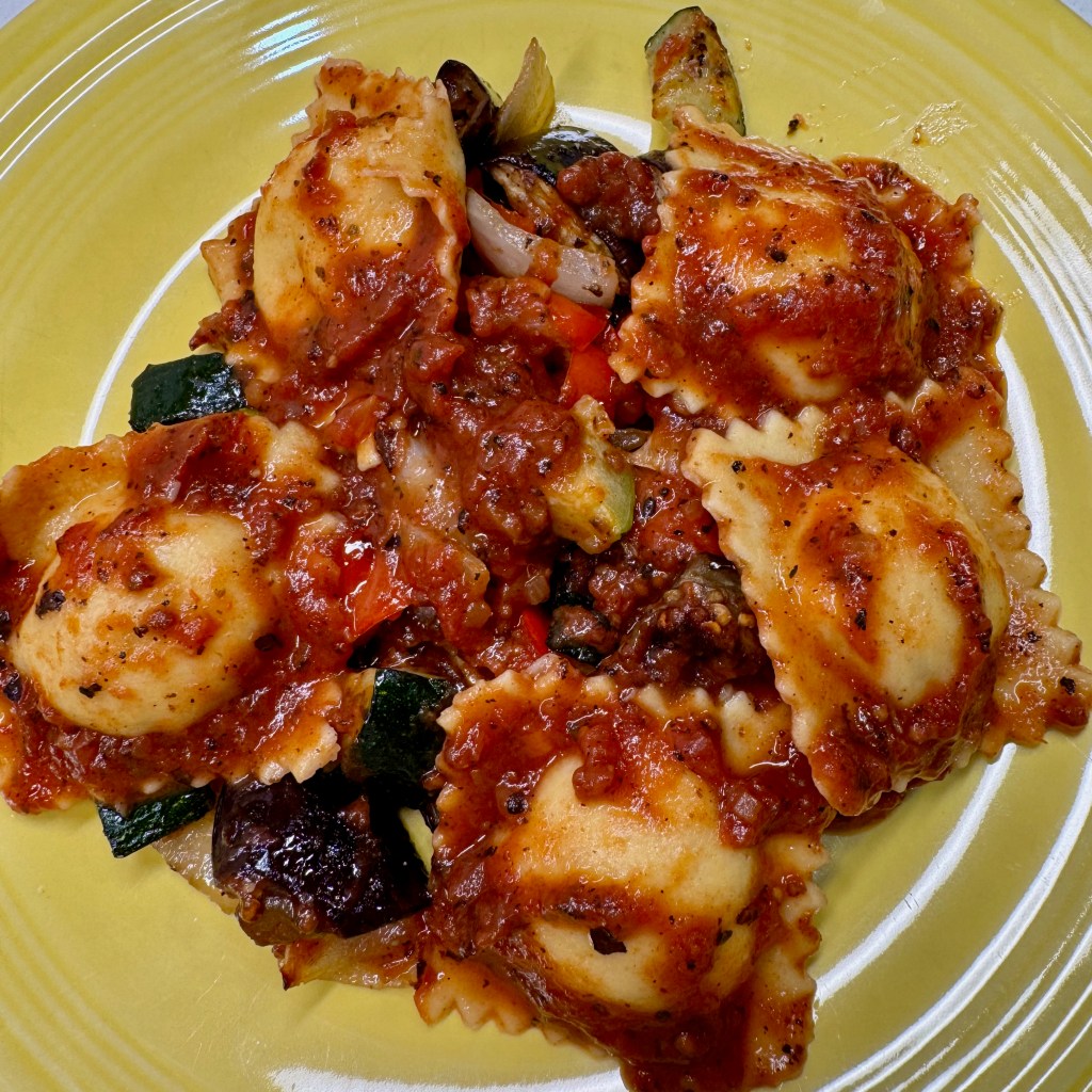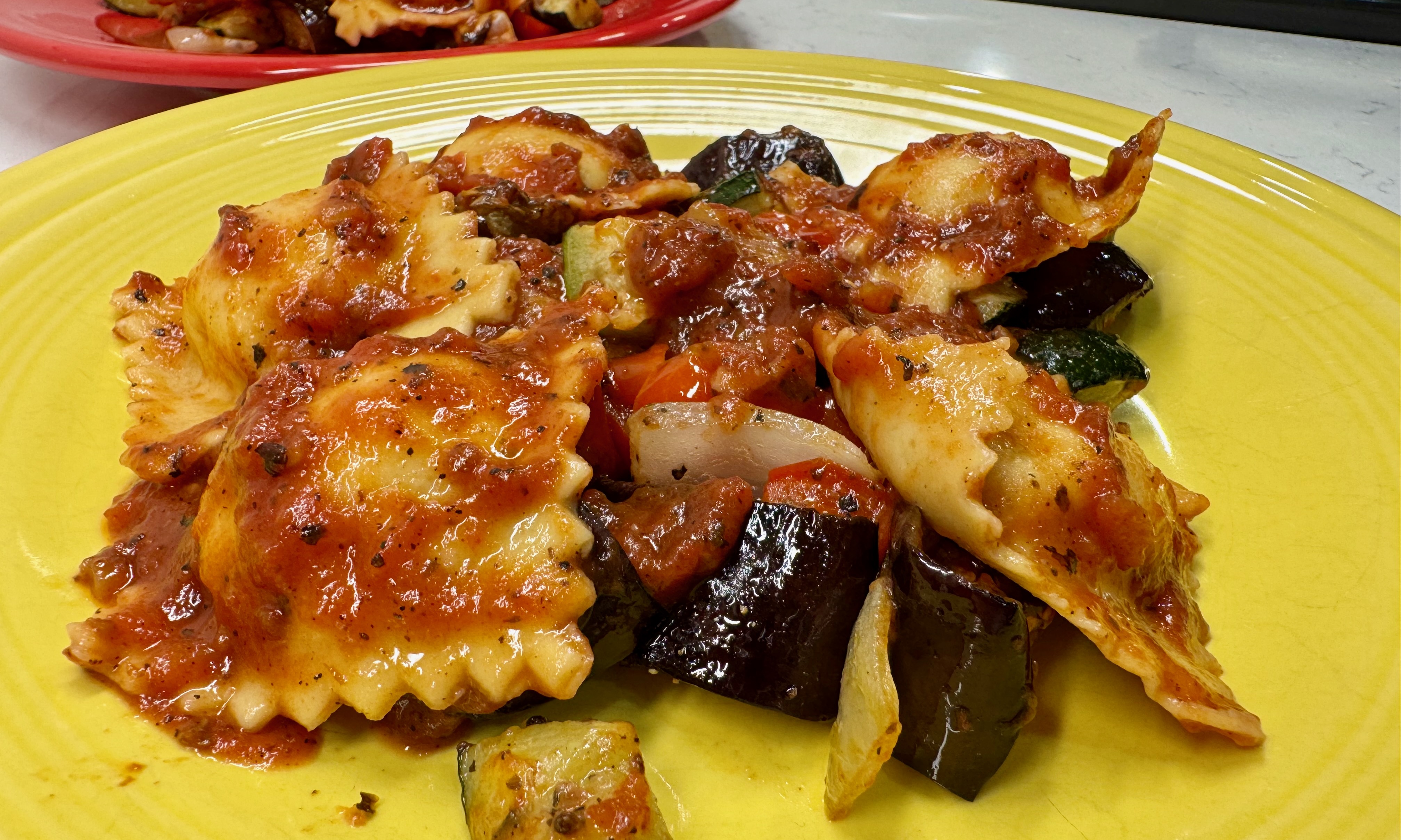 - Retrieve the pasta with a vented spoon and transfer directly to the tomato sauce. Toss gently and arrange the ravioli on serving plates. Toss the roasted vegetables in the remaining sauce and spoon over the ravioli portions. Serve at once.
