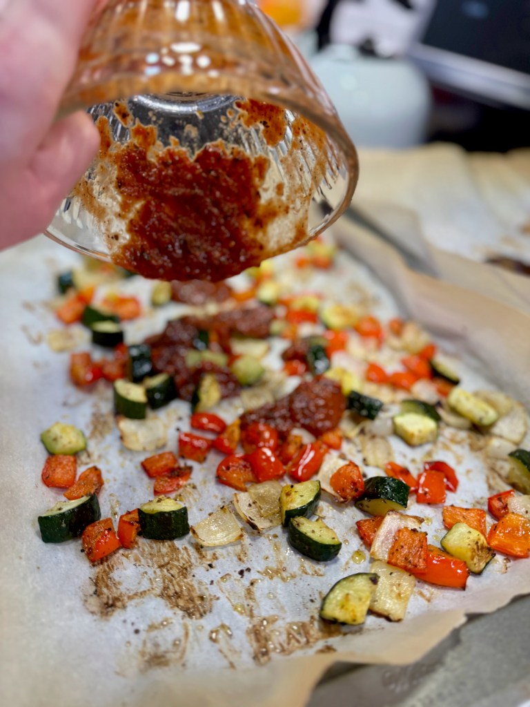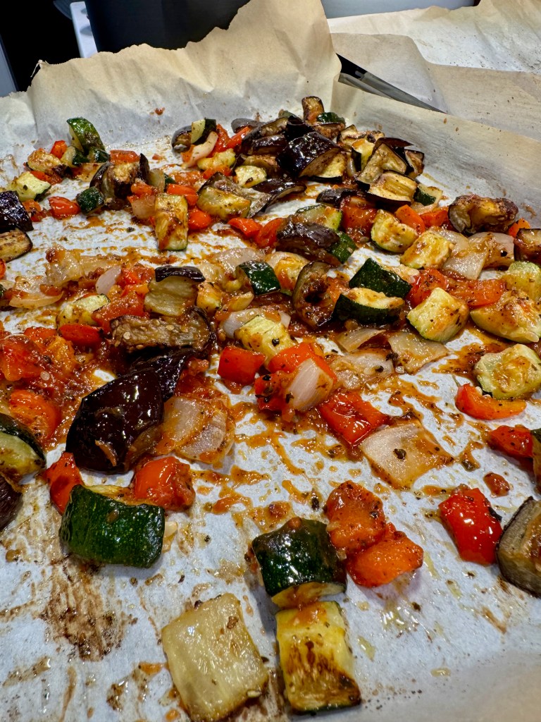 I salted my eggplant chunks for a few minutes first, to help draw out excess moisture, and this worked really well for achieving crispy edges when they roasted. The other vegetables were roasted on a separate sheet, and then I tossed everything gently in a fire-roasted tomato sauce which, if you can believe it, was from a can! Sure, I could have made my own sauce, but I was trying to be thrifty and use up some leftover pizza sauce, and it was a winner! If you make your own sauce, keep the flavors simple and try to make it on the thicker side.