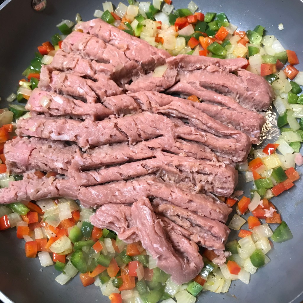 Saute the onions and peppers until soft, but don’t brown them.