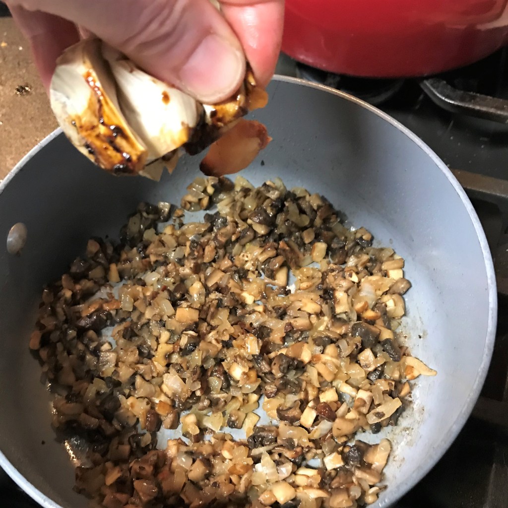 Season with salt, pepper and umami seasoning. Add roasted garlic and stir to blend it in.