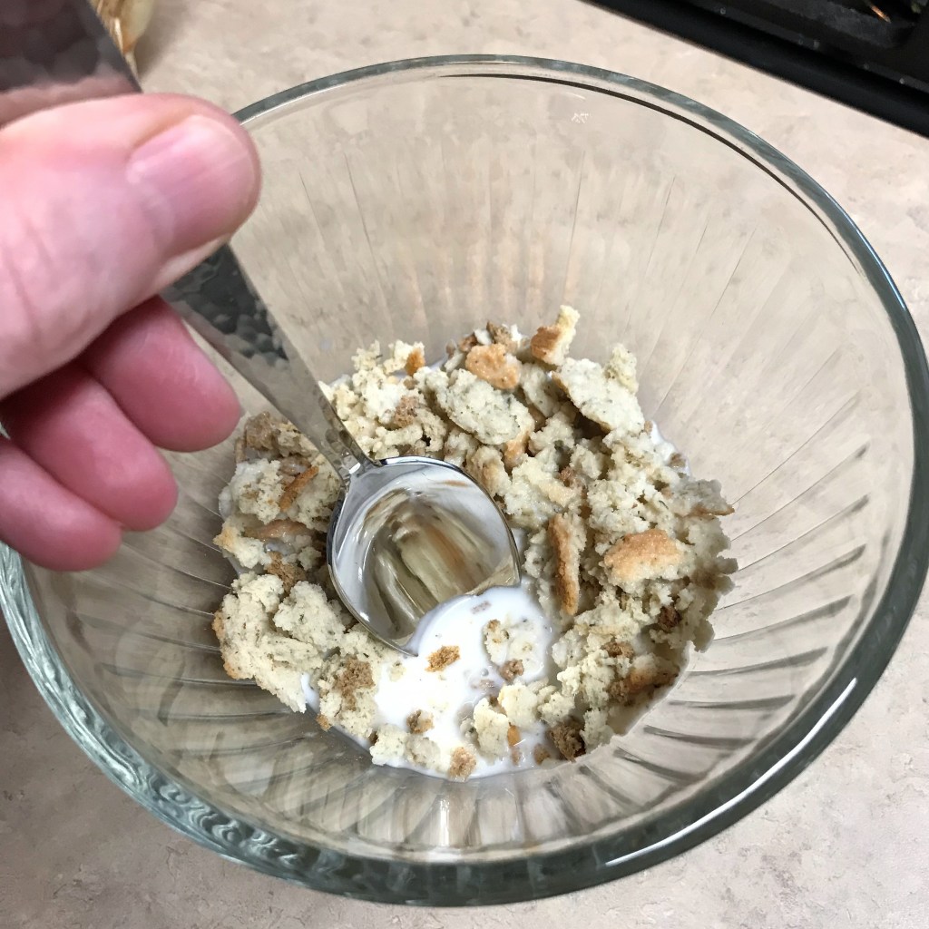 In a bowl large enough for combining the full meatloaf mixture, moisten the panko crumbs in the milk. I usually eyeball the amounts, but it is approximately 1/3 cup of each. Give the mixture (called a “panade”) enough time to hydrate, then push it to one side of the bowl.