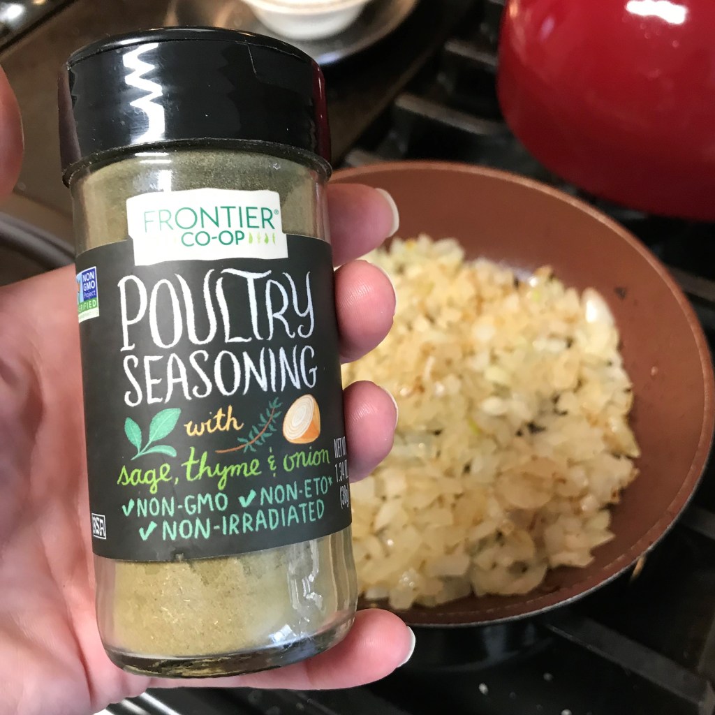 Heat a small skillet over medium heat. Swirl in extra virgin olive oil and add the diced onion. Saute until onions are soft and translucent. Sprinkle with salt, pepper and poultry seasoning.