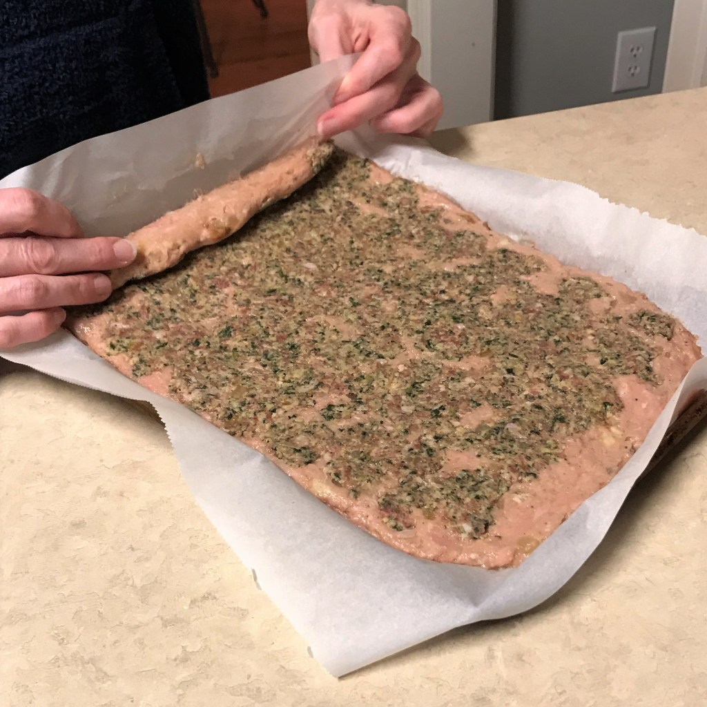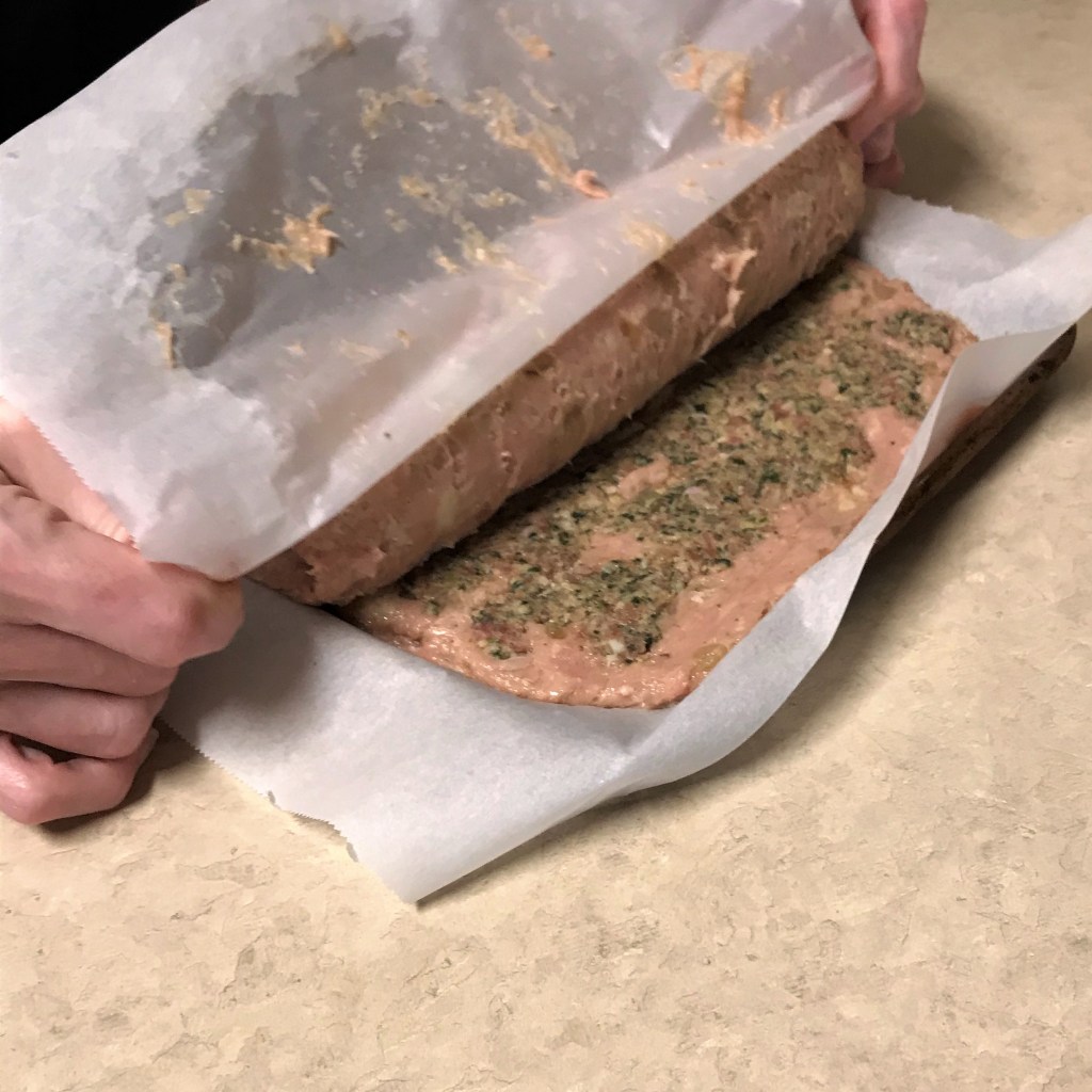 To roll up the meatloaf, begin by lifting the parchment and slightly fold the meatloaf onto itself. Continue this motion, keeping the roll tight as you go. Some of the turkey may stick to the parchment, but you can use a rubber scraper to remove it and patch the roll. Full disclosure: this step was pretty messy, but I pressed on to finish the shaping.