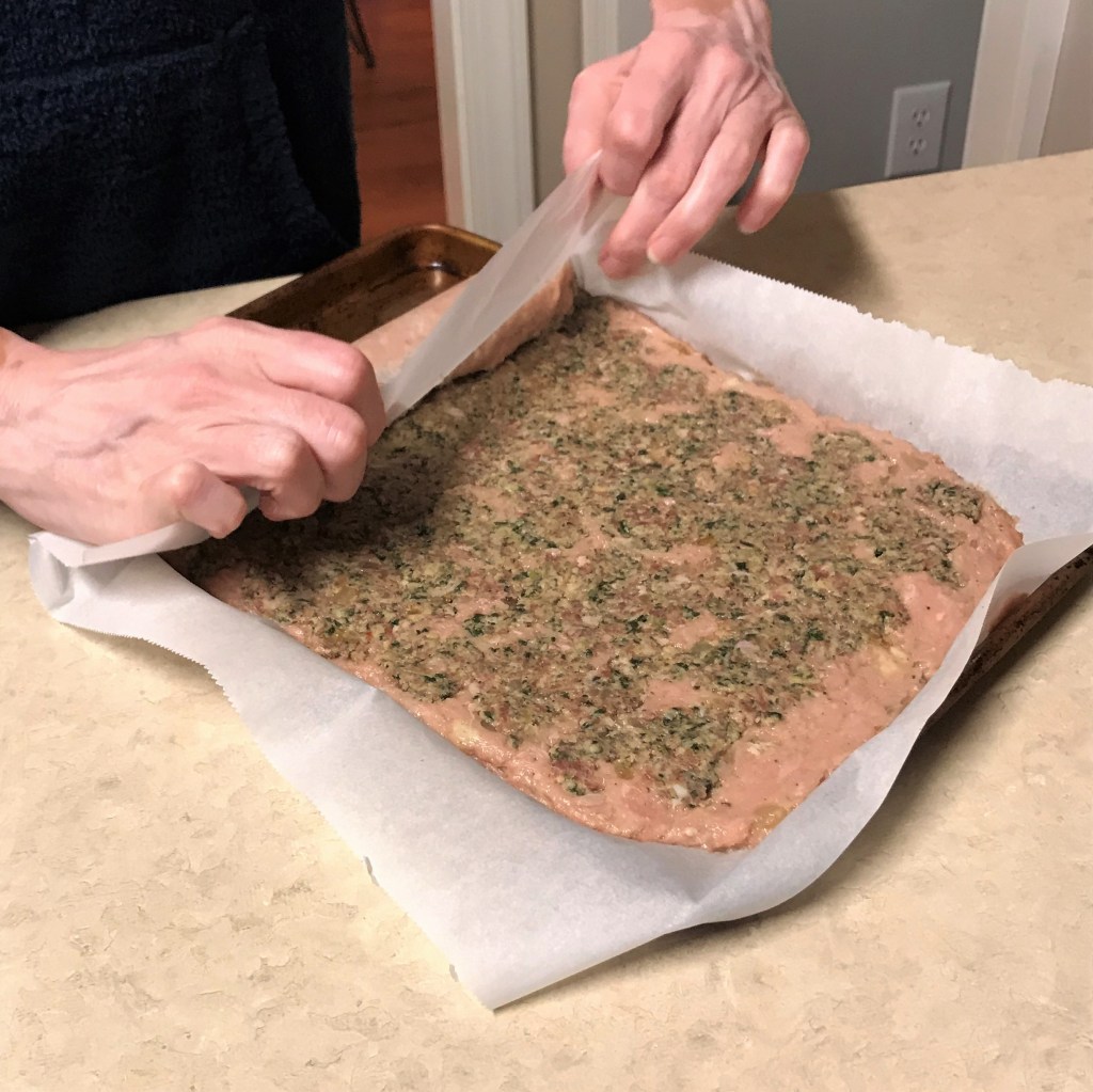 Line a small baking sheet with a piece of parchment paper. Scatter panko crumbs evenly over the paper. Using a rubber spatula, spread the ground turkey mixture evenly over the crumbs, shaping a rectangle approximately 9 x 13″.