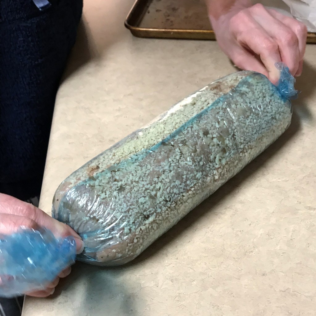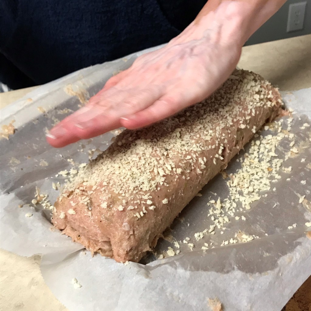 Press on any loose bits of panko crumbs, adding more if needed to lightly coat the shaped meatloaf. Wrap the rolled-up meatloaf as tightly as you can in a sheet of plastic film, twisting the ends as with a sausage chub. Tuck the twisted ends underneath, and chill the roll overnight.
