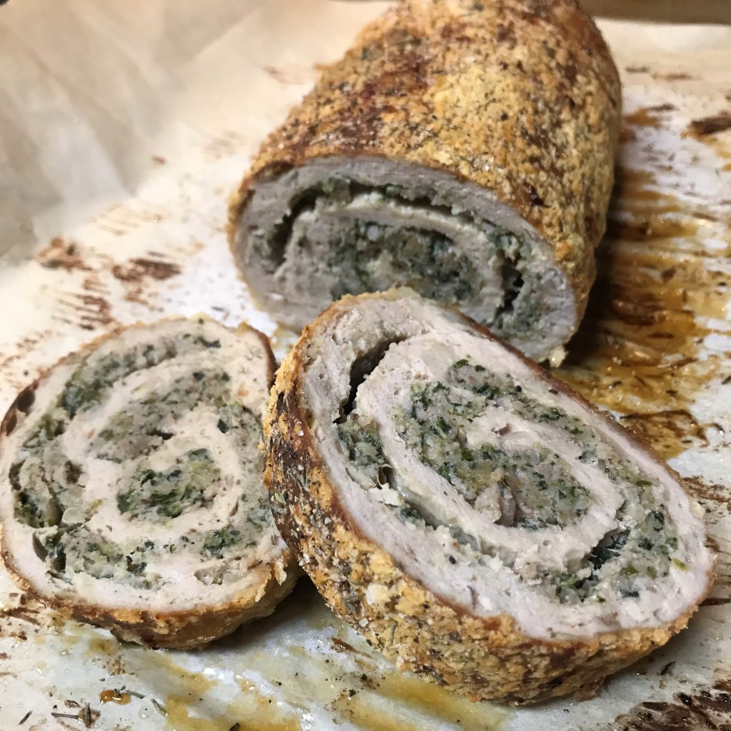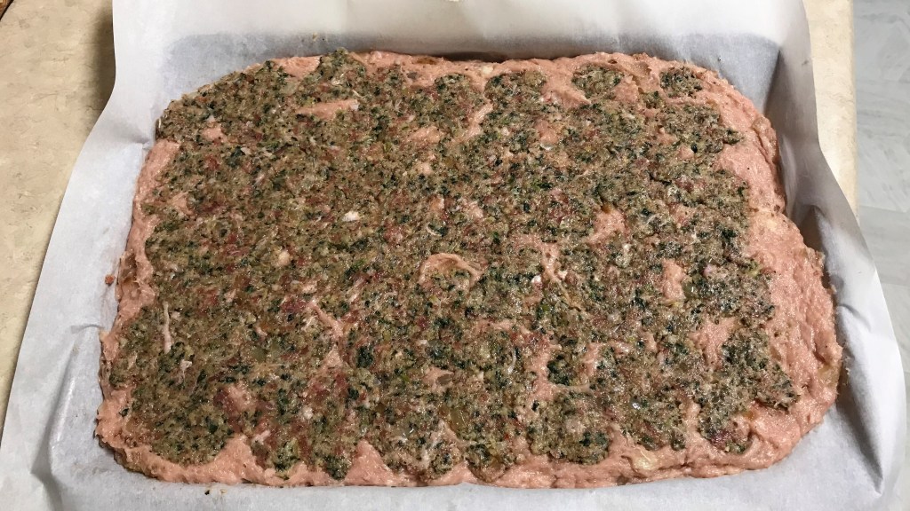 If you enjoyed my darling husband’s recent guest post for spinach balls, now is the time to make a batch because the sausage stuffing swirl in this meatloaf makes use of leftover spinach balls. If you don’t have time to make the spinach balls in advance, you could create a similar blend with some herb stuffing mix and frozen spinach (I’ll offer suggestions).