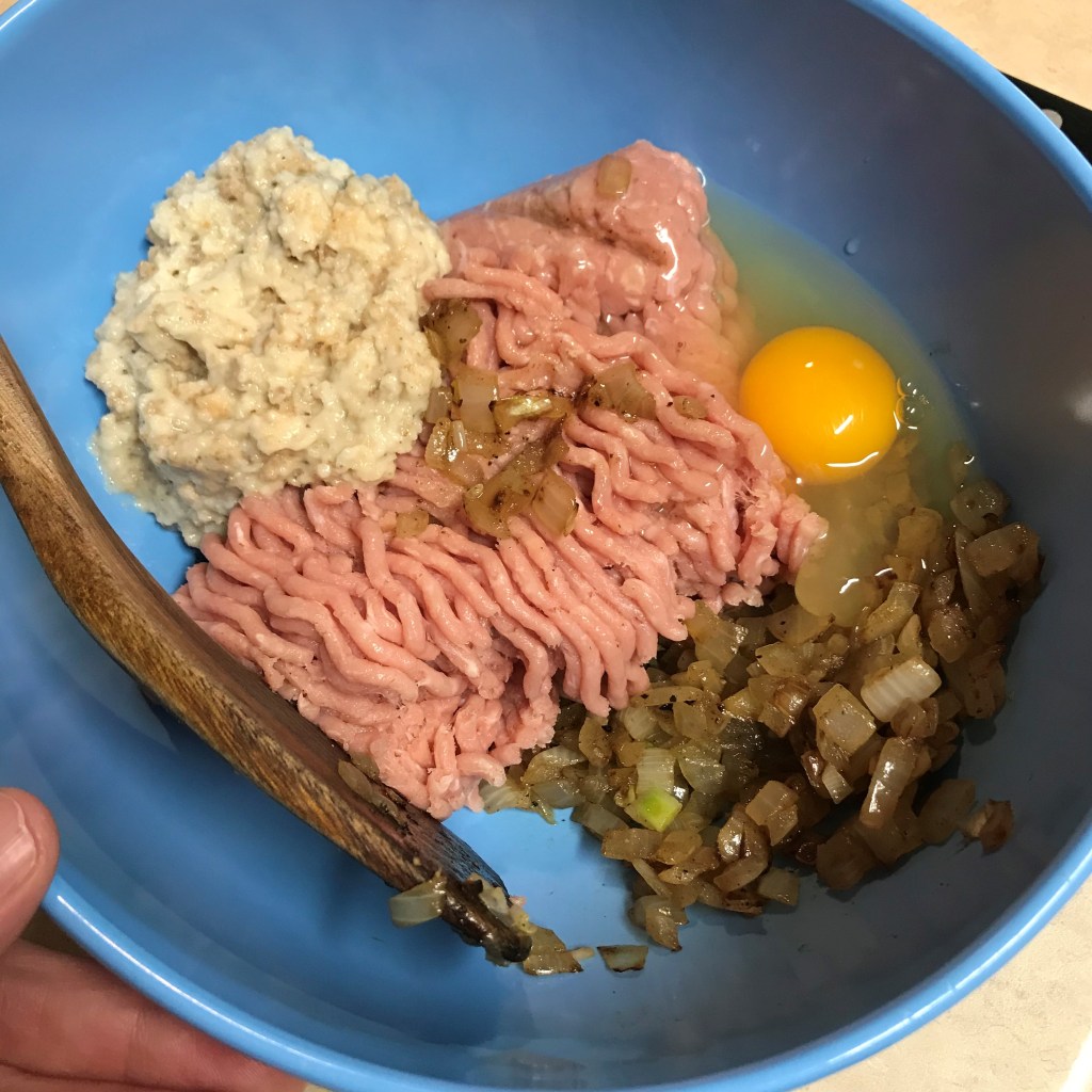 In a medium bowl, combine the ground turkey, half of the sauteed onions, stuffing “paste” and egg. Season the mixture with salt and pepper, then set aside.