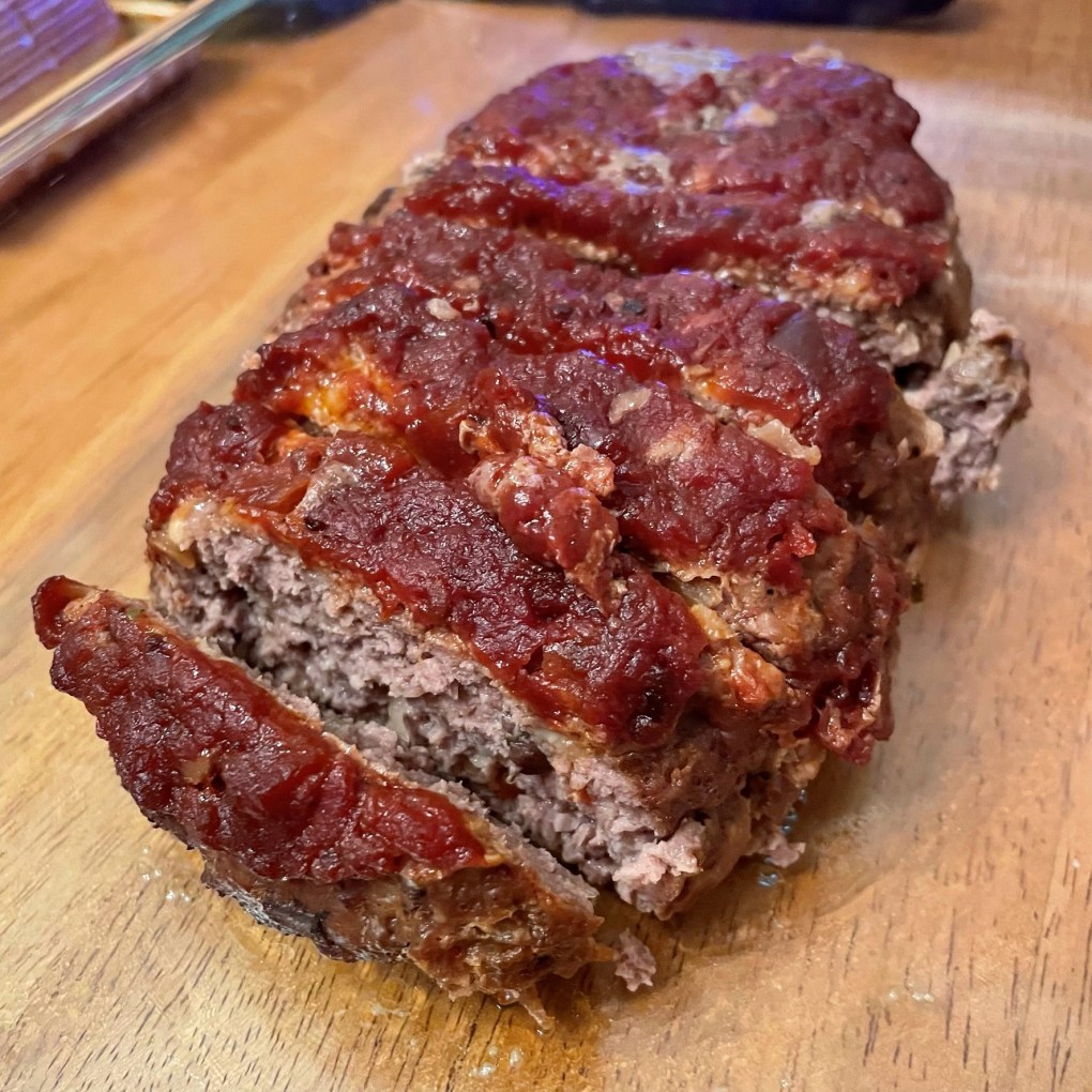 The only way to know if meatloaf is done is to check internal temperature for at least 165° F. This one is ready! Rest 15 minutes before slicing.