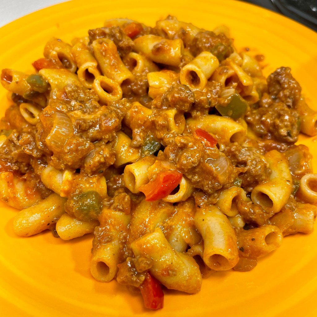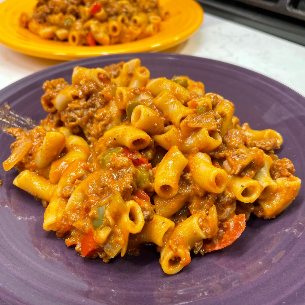 In the traditional sense, goulash— which has its roots in Hungarian cuisine— would not have the Italian flavors found in spaghetti sauce, and I’ve come around to making it my own way in my adult years. I do use ground beef, as my mom did, and this is a distinct Americanization of goulash, which would traditionally be made with stewed cuts of meat, plus vegetables and probably potatoes.