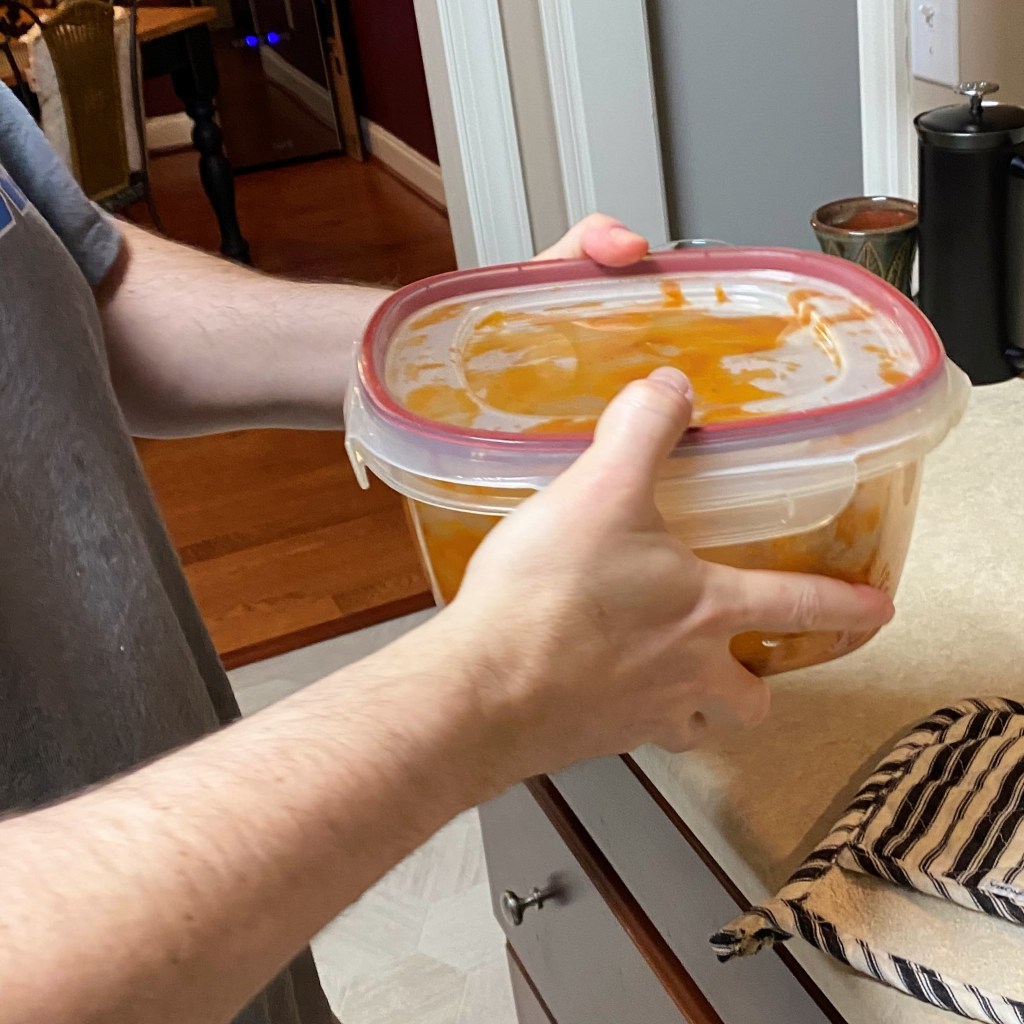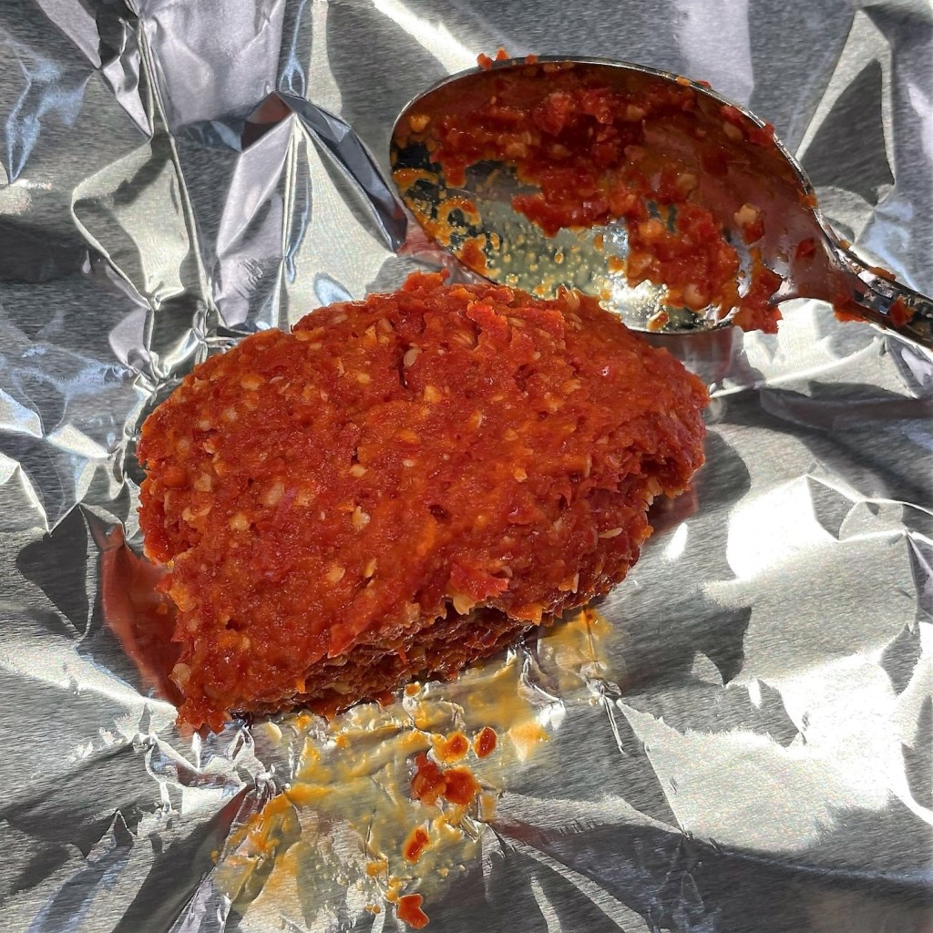The first step is fermentation, a roughly week-long process that builds the deep, funky, earthy flavor that we know and love in sriracha. Clean the peppers well, and cut off the stems but keep the dark green “caps” that connect to the top of the pepper. Give the peppers a rough chop and add them (seeds and all) to the bowl of a food processor with brown sugar, fresh garlic and kosher salt. Pulse several times until the mixture is coarse and chunky but well blended. Transfer it to a mason jar, cover it and set it aside on the counter for 5 to 7 days. The Serious Eats article suggested stirring the pulp every day, but I’ll admit that I missed this when I was in the thick of things, and mine managed to ferment without assistance.
