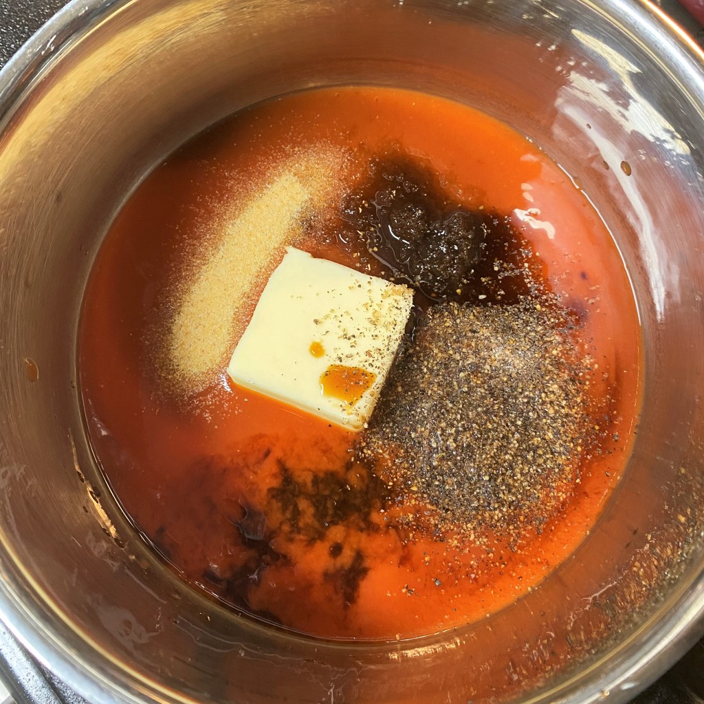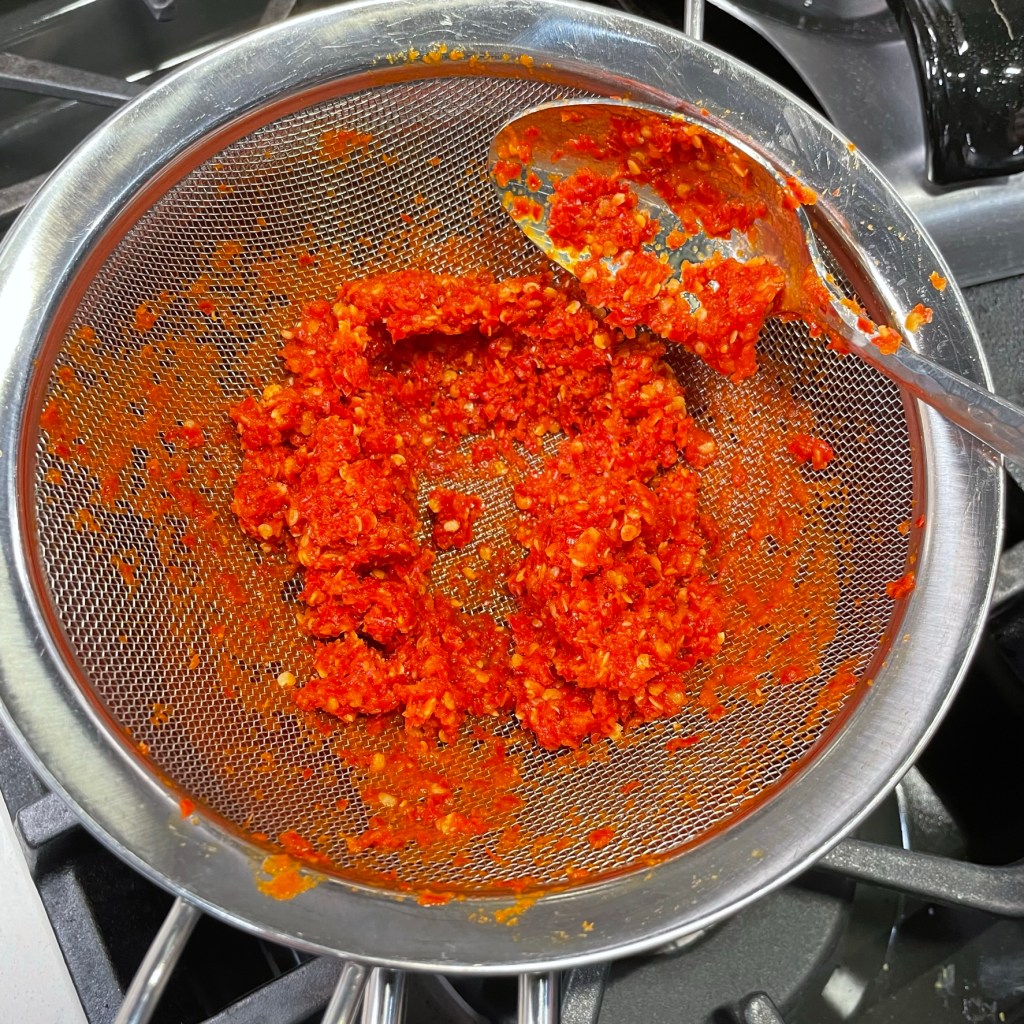 The whole jar’s worth of pulp goes into the blender with a splash of white vinegar, and this time, you’ll puree it until the mixture is as smooth as you can get it. Then, press it through a mesh strainer to separate the solids. Last year when I made this, I spread that nasty lump of hot pepper solids on the ground around the tomatoes in my garden. Probably another reason that I had a decent harvest for the first time in ages, as I can’t imagine any critter wanted to be near that stuff!