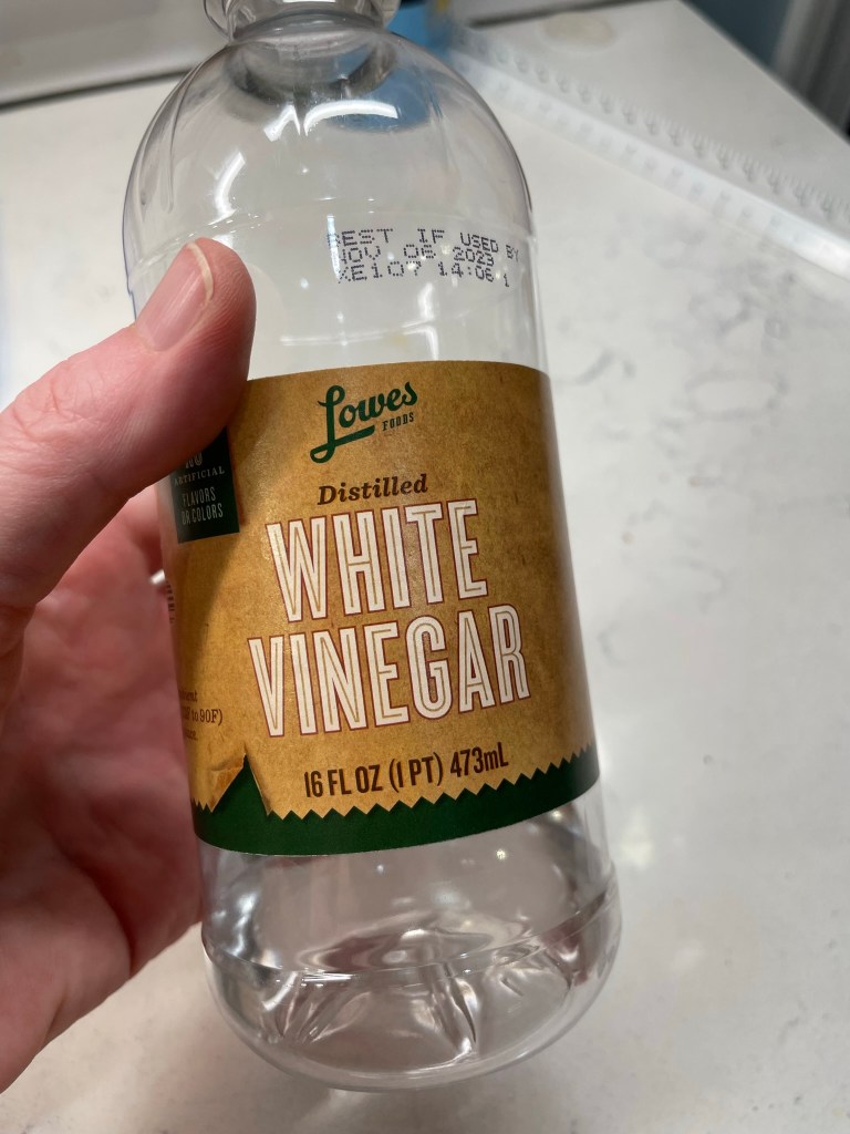 The disadvantage of making your own sriracha is, well, the same. Without heavy preservatives, homemade sriracha must be stored in the fridge and even then, it will not keep as long as store-bought. This recipe only yields about a cup, so that shouldn’t be a problem if you love sriracha because you’ll likely use it up pretty quickly. There is one preservative ingredient, however, that will be making its way into my homemade version of sriracha, and that is acetic acid. I just happen to have some in my pantry cabinet— and you likely do as well. Take a look:
