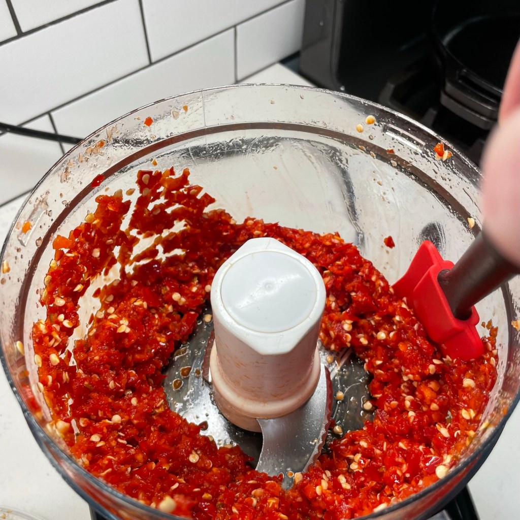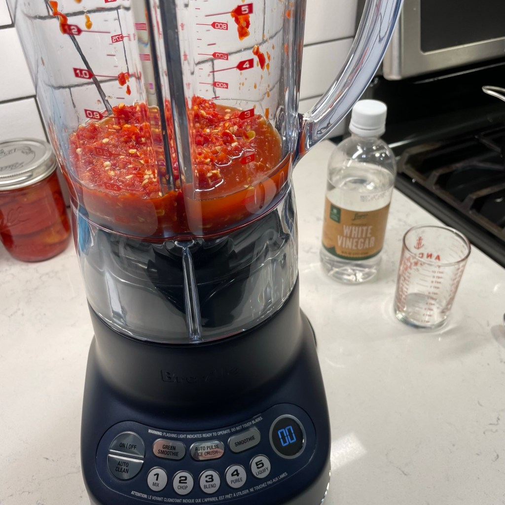 All vinegars have some level of acetic acid, but white distilled vinegar checks in with about 5%, higher than other culinary vinegars. It will help preserve both the color and freshness of my homemade sriracha, while also brightening up the flavor notes, and it comes into play in the next step— pureeing the fermented Fresno paste. Ready to finish this?