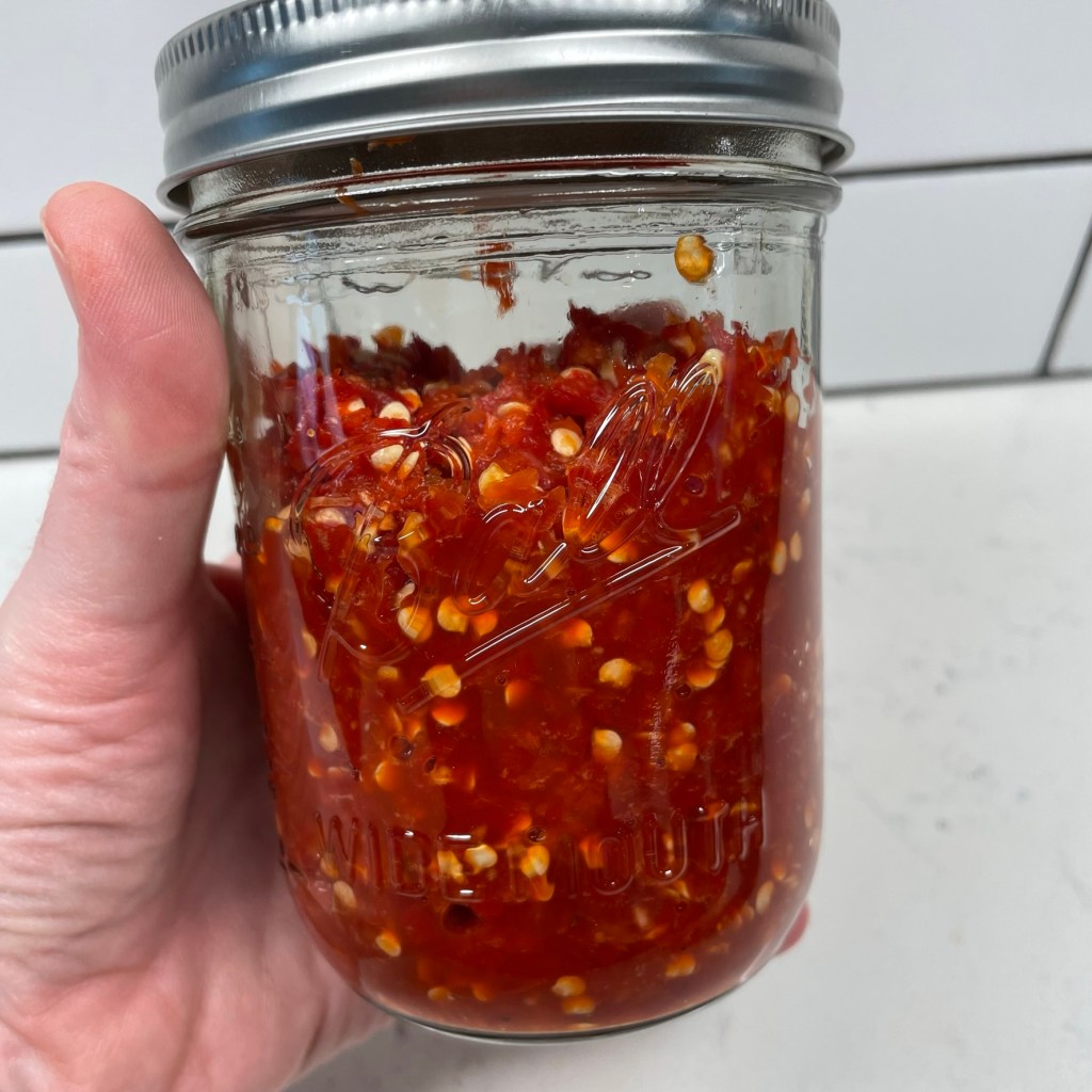 The strained puree simmered for about 30 minutes until it reached the consistency one would expect for sriracha, and then I transferred it to a jar for longer storage—in the fridge!