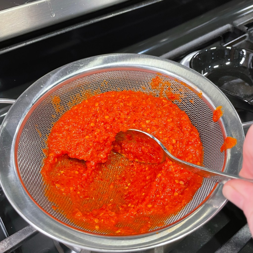 - Pour pepper puree through a large mesh strainer into a saucepan. Use a spatula to gently press and scrape the puree through the strainer. Discard the solids.