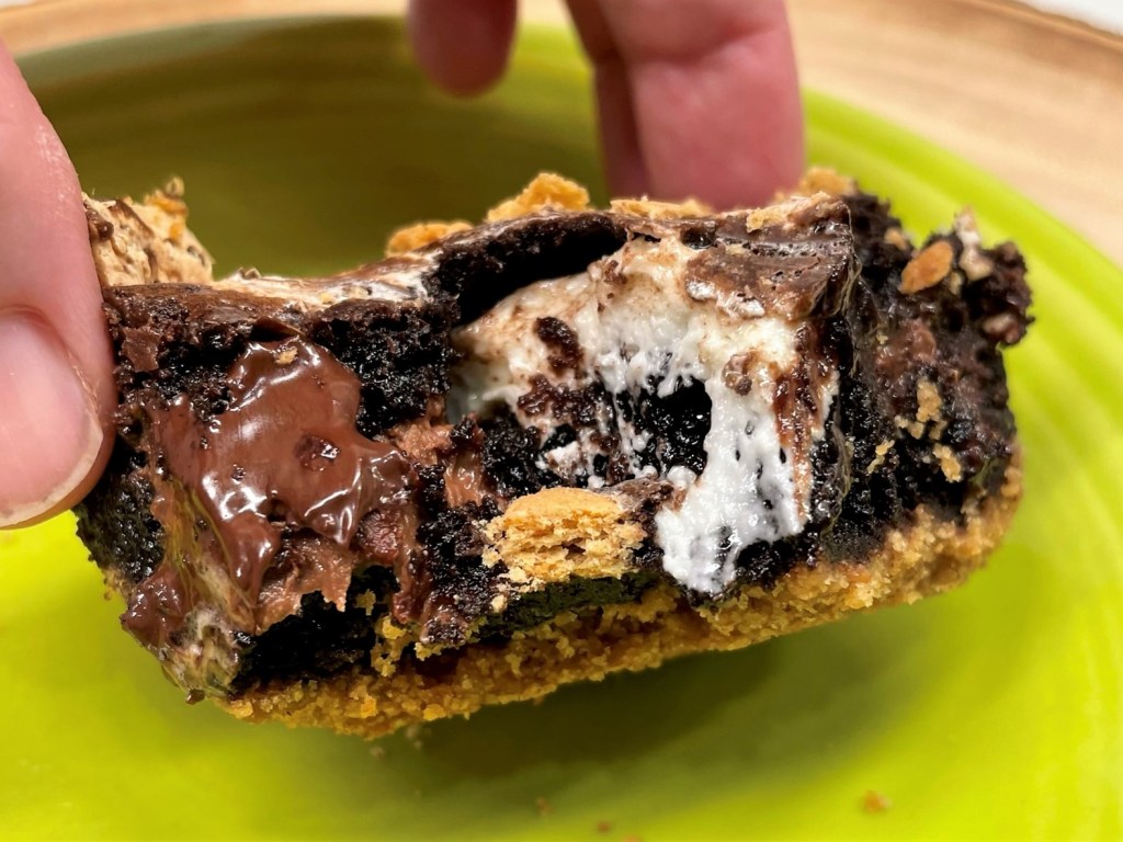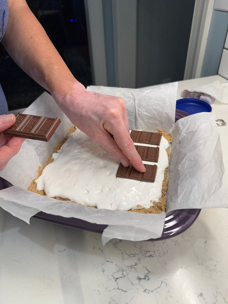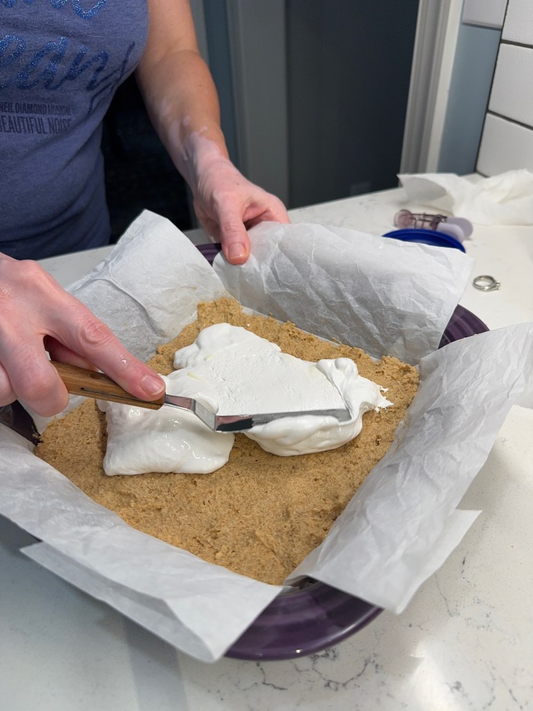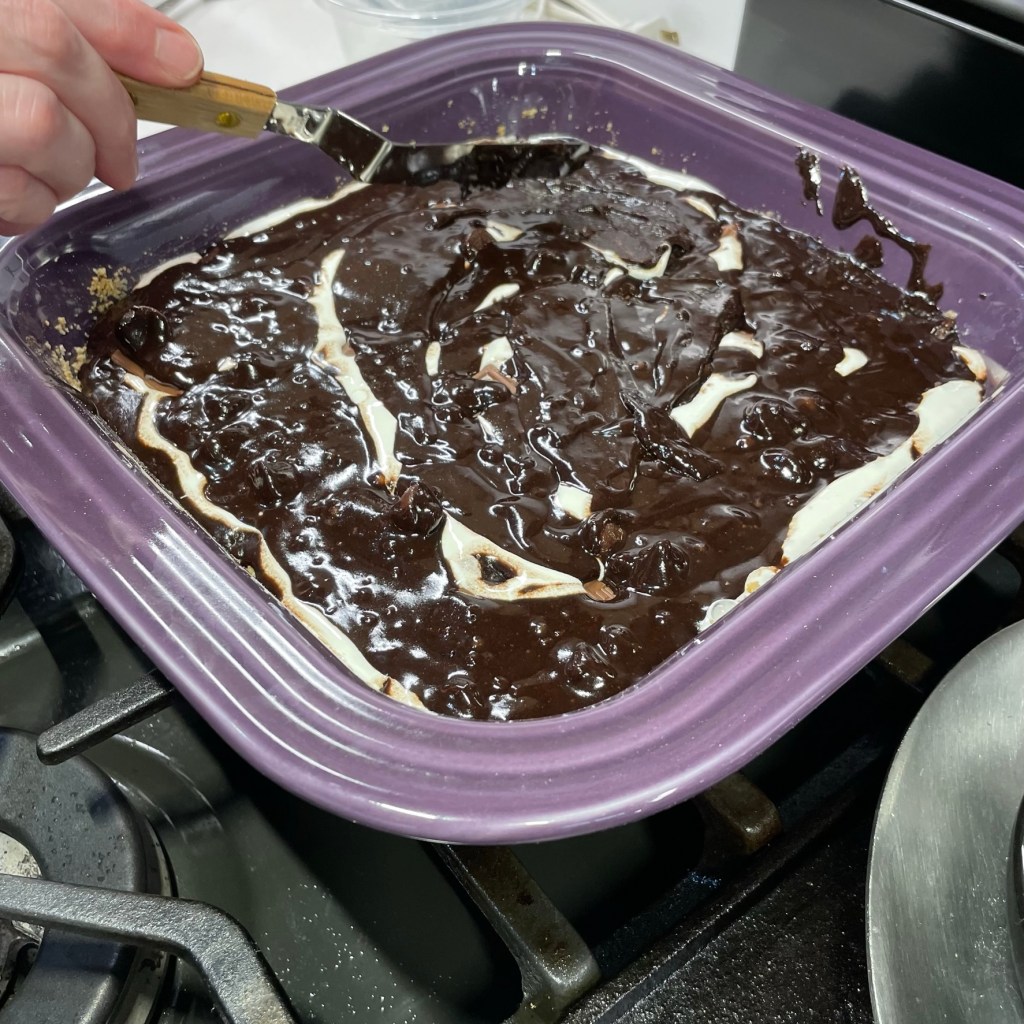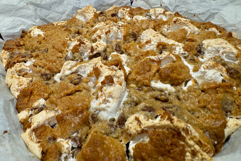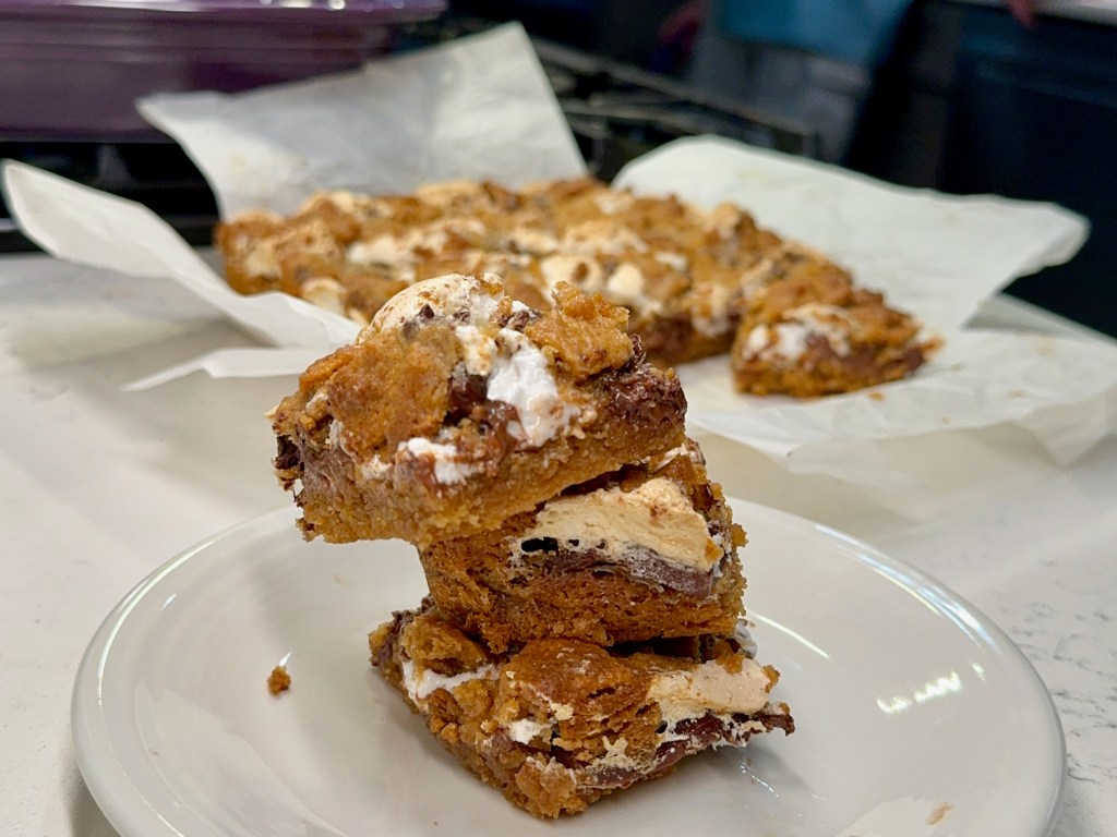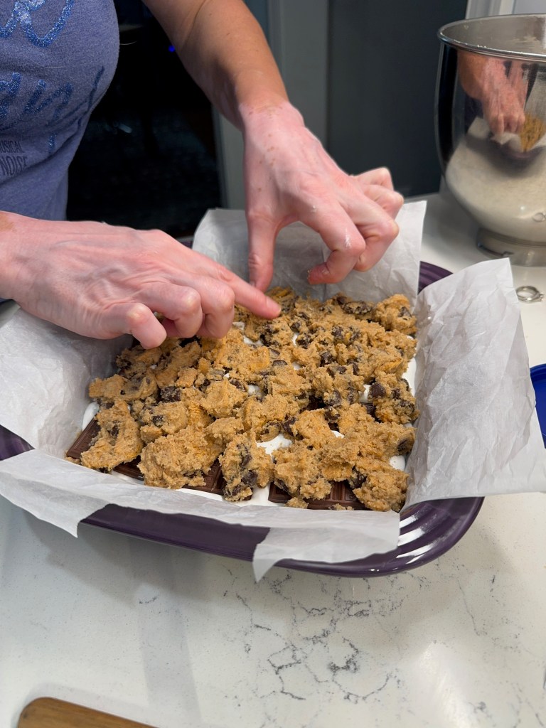 Spread the batter evenly into a buttered, parchment-lined pan, then spoon and swirl a bit of warmed caramel dip over the top. Scatter a few tablespoons of Heath candy bits on top and bake until the blondies test done with a clean toothpick.