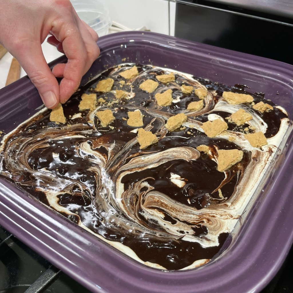 - Spread batter evenly over parchment. Warm the caramel dip slightly in the microwave for easier swirling. Pipe or spoon caramel dip over batter and swirl with a chopstick or spoon handle. Sprinkle on Heath candy bits.