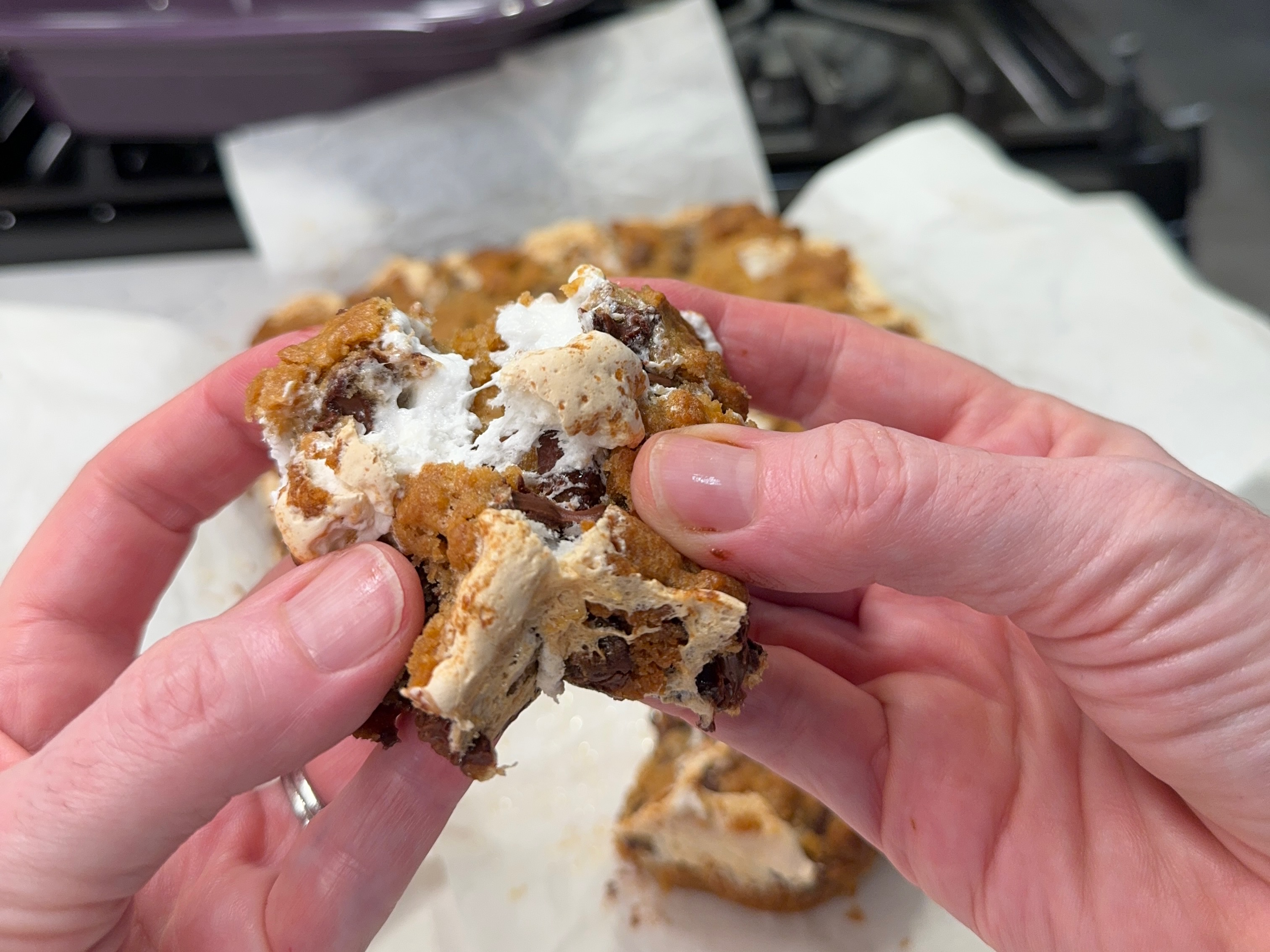 - Cool for at least 30 minutes before using parchment flaps to lift blondies from the pan. Cut into squares for serving. Keep leftover blondies wrapped or in a sealed container at room temperature for up to three days.