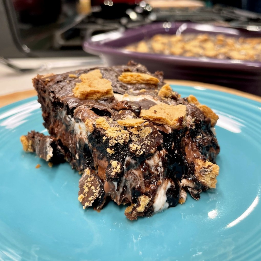 Spread the batter evenly into a buttered, parchment-lined pan, then spoon and swirl a bit of warmed caramel dip over the top. Scatter a few tablespoons of Heath candy bits on top and bake until the blondies test done with a clean toothpick.