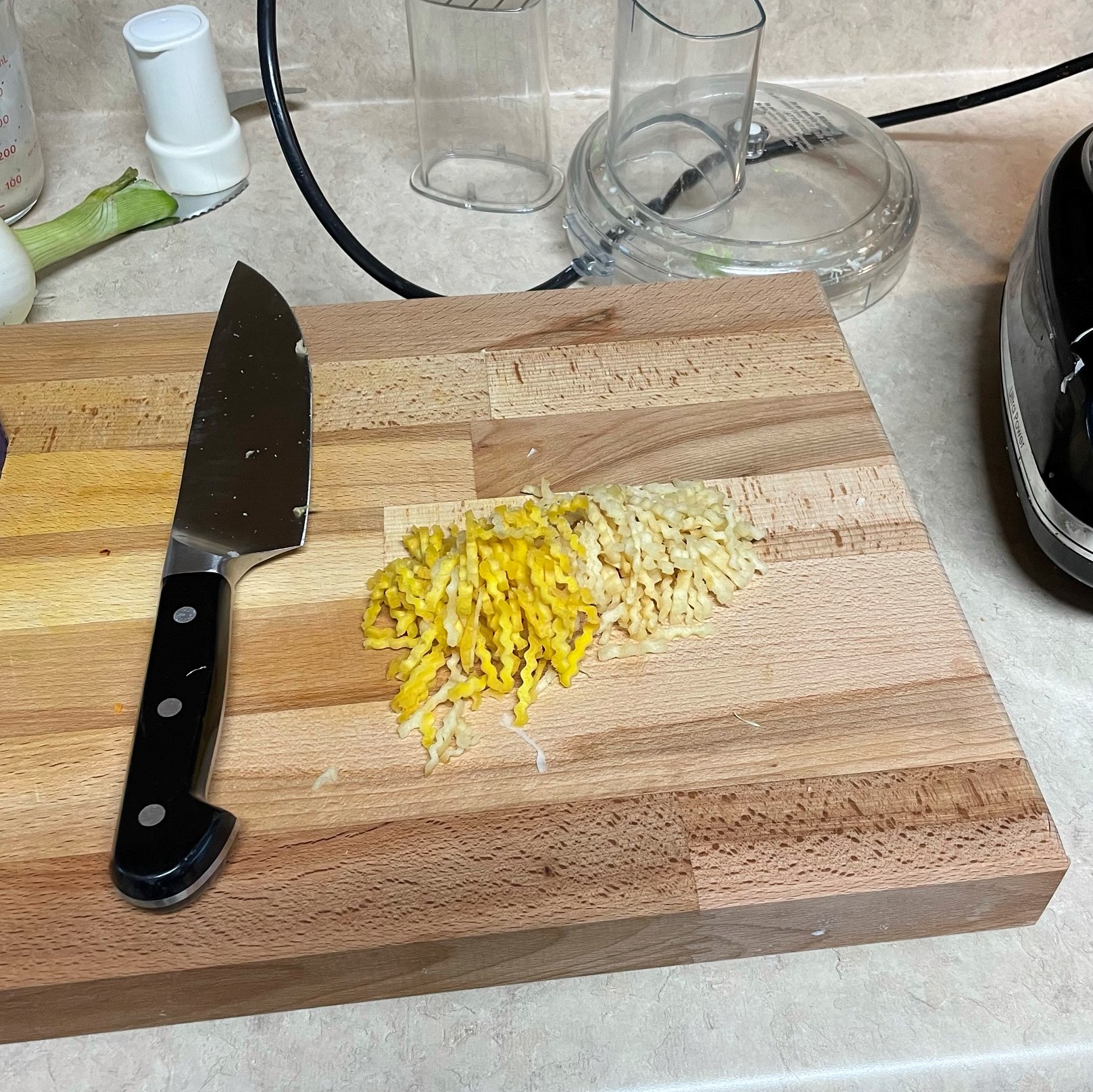 I repeated the process with the larger, yellow tomatoes, which I took time to de-seed first (I kept the seeds for another purpose). I held back the flesh of about half a yellow tomato to use later for garnish, and the rest went into the large bowl of my food processor with the little green tomatoes. A few of them had tougher stems, which I cut off, but most of them were tender enough to toss into the mix.