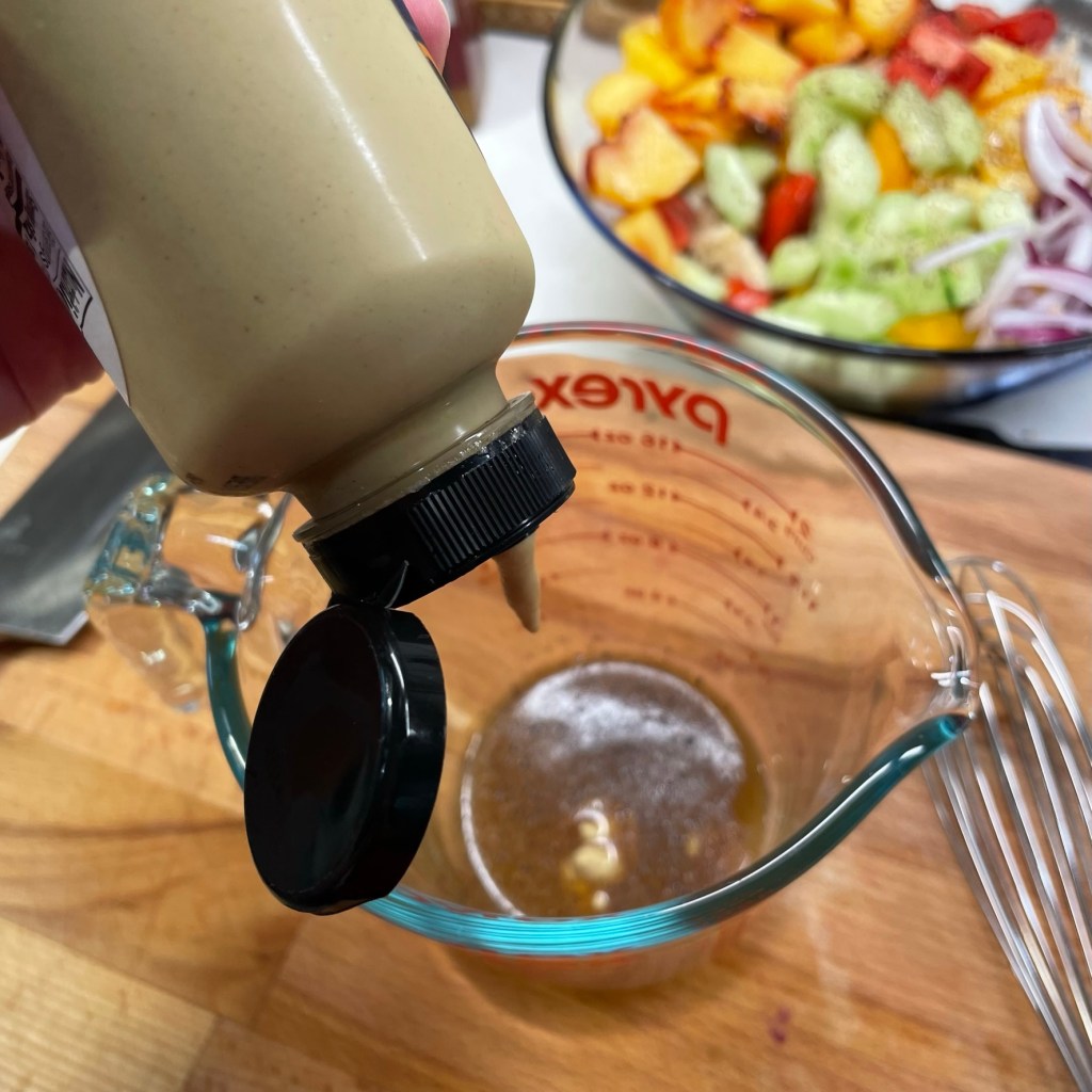 A classic panzanella would be strictly savory, so a vinaigrette with Italian herbs and garlic would be appropriate. But I wanted a lighter, fruitier touch for this one because of the sweet summer peach, so I started with a citrus-y vinegar from Trader Joe’s and jazzed it up with Dijon, a squeeze of fresh lemon and a generous drizzle of fruity, extra virgin olive oil. Any light, fruity vinegar would work well here, or even a white wine or champagne vinegar. If yours is tart and sharp, give the dressing a little balance with a bit of honey or a few pinches of cane sugar. And don’t forget salt and pepper.