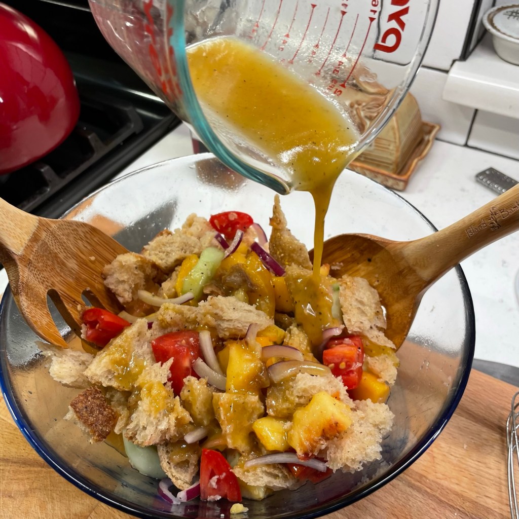 Pour dressing all over salad. Toss gently to incorporate, and allow the bread a few minutes to soak up the dressing and juices.