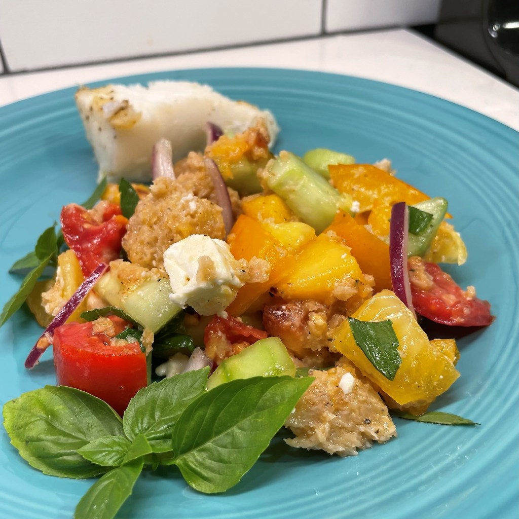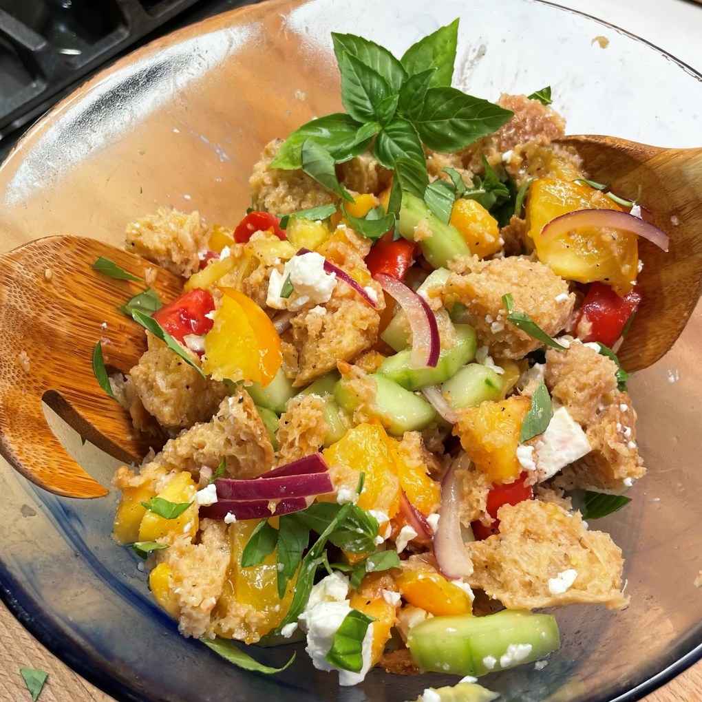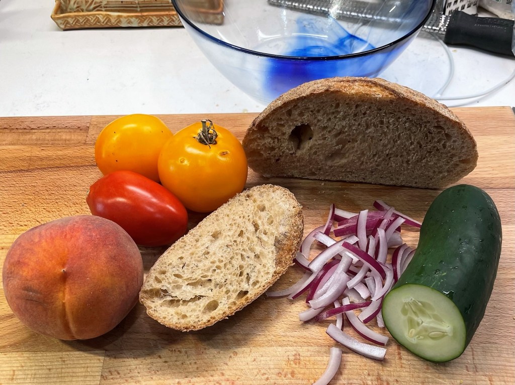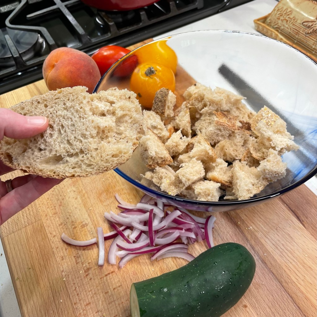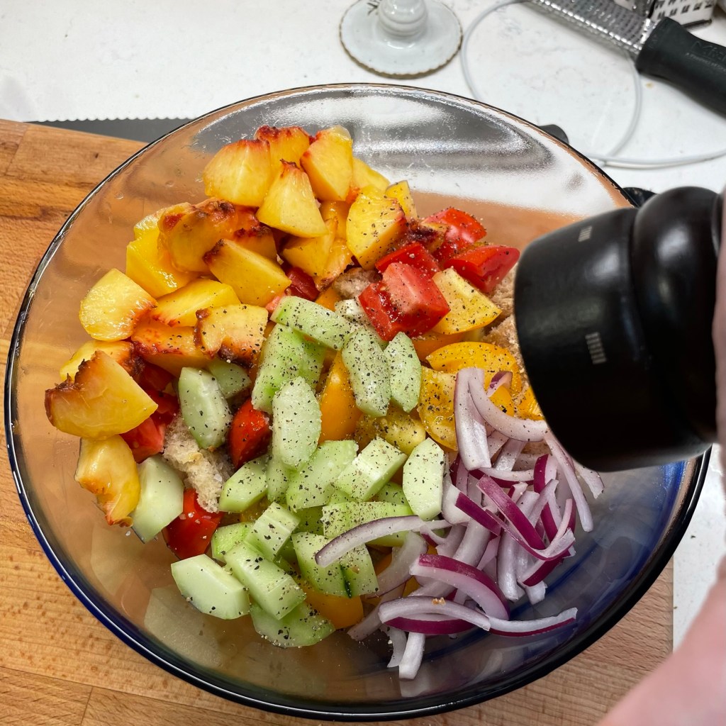 A ripe and juicy summer peach puts a delicious and unexpected twist on a classic panzanella. It's a cool and tasty way to beat the summer heat!