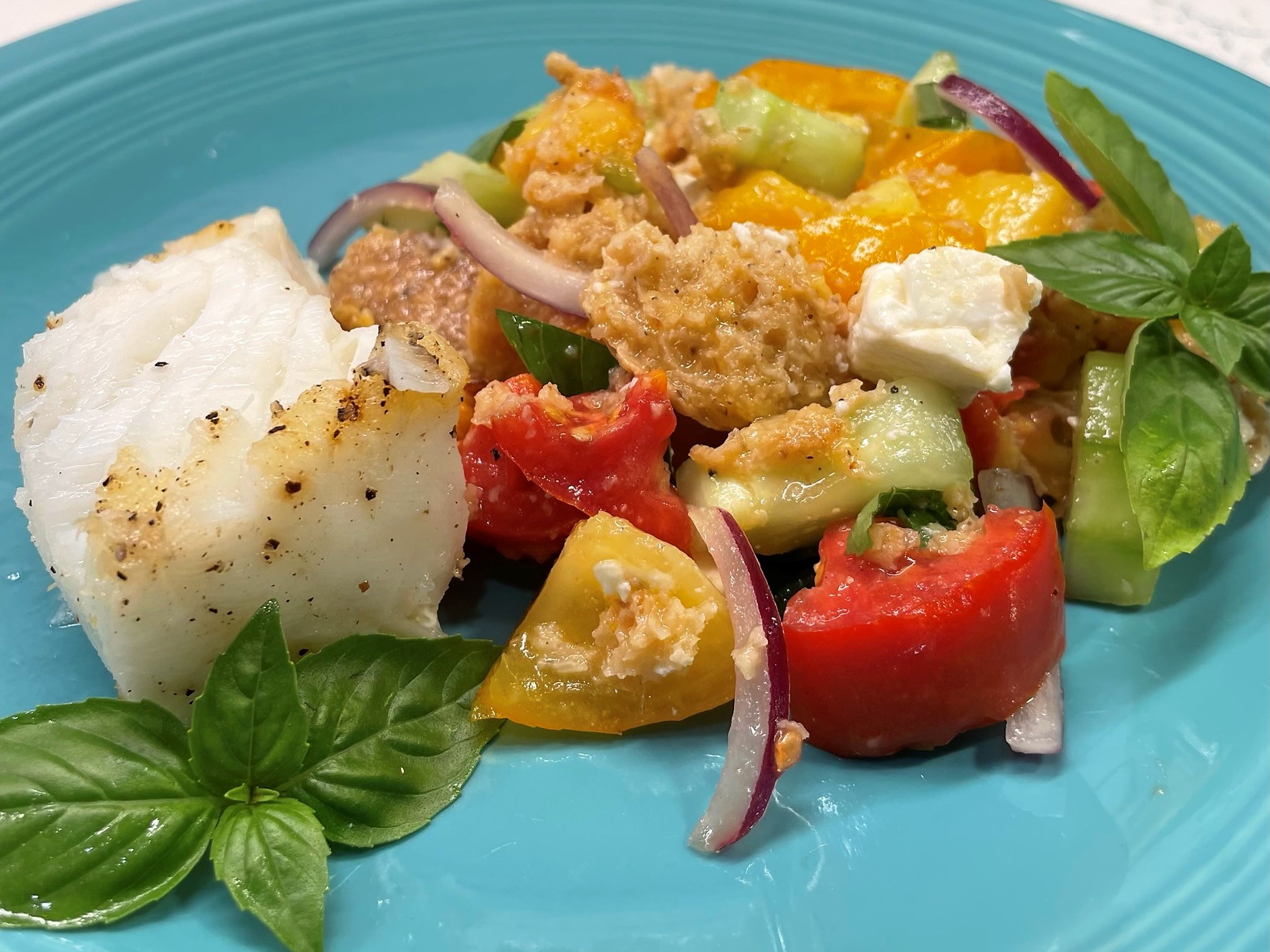 I served my peach panzanella with petite fillets of halibut. They were super easy to make, seasoned with only salt and pepper and baked in the oven for a mere 15 minutes. Easy, quick and done!