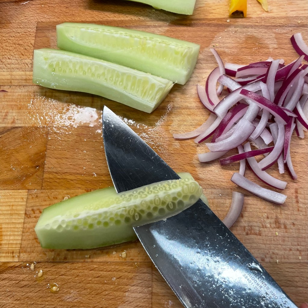 English cucumber is ideal for this type of salad, for its smaller seeds and thinner skin. My grocery stores all sell this type of cucumber, but usually they have a waxy coating to keep them fresh during transport from God-knows-where (yet another reason to choose local). You can use anything you have on hand for smashing it— the flat side of a chef’s knife, bottom of a skillet, whatever— but don’t use a heavy hand unless you want cucumber juice all over yourself and the kitchen. Just enough to crack it open is good, and then use a knife to cut the smashed cucumber into generous chunks. Season it, and toss with the other ingredients. Could it be more simple?