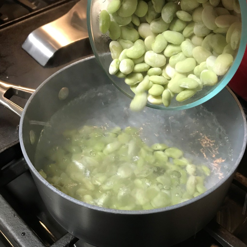 The green beans were the only ingredient in this salad that required cooking— thankfully, we only needed to have the stove on for about 10 minutes— so I got that going with a pinch of baking soda in a pot of barely-boiling water. The alkaline nature of the soda helps preserve the color of the green beans, and a shock of ice water at the end of cooking also helps with color retention.