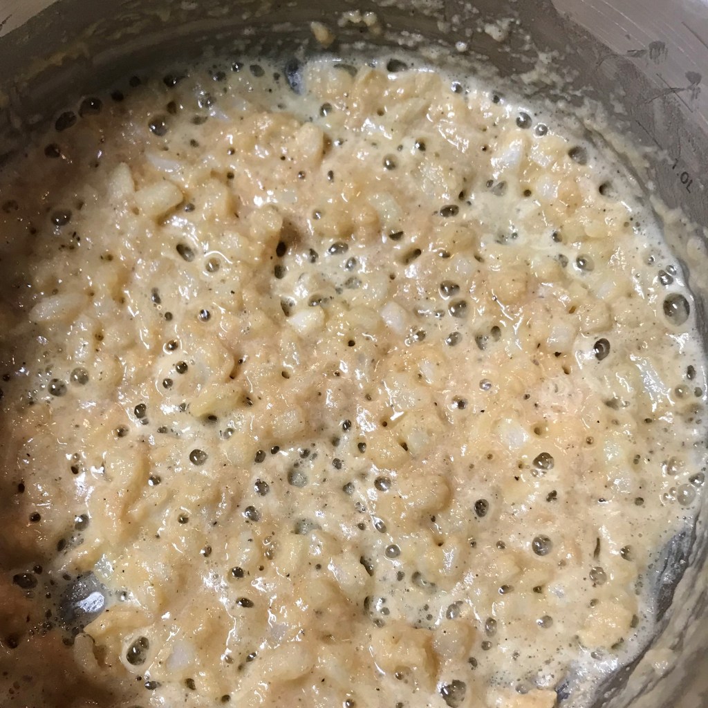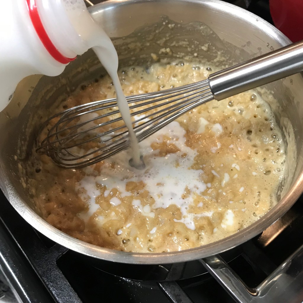 Cook the chopped onions and flour in the butter until it’s lightly browned and bubbly all over.