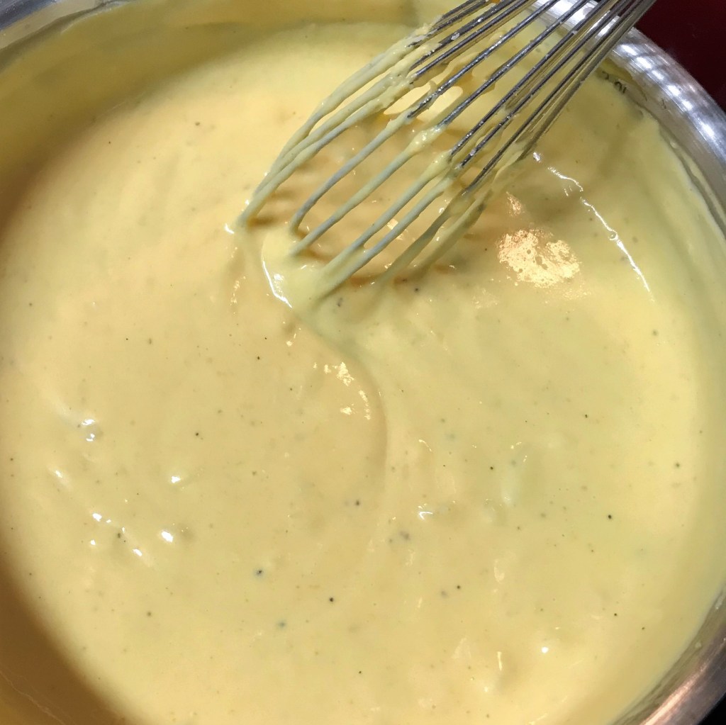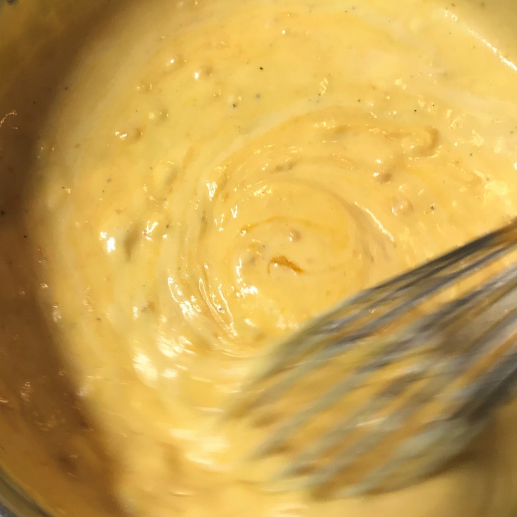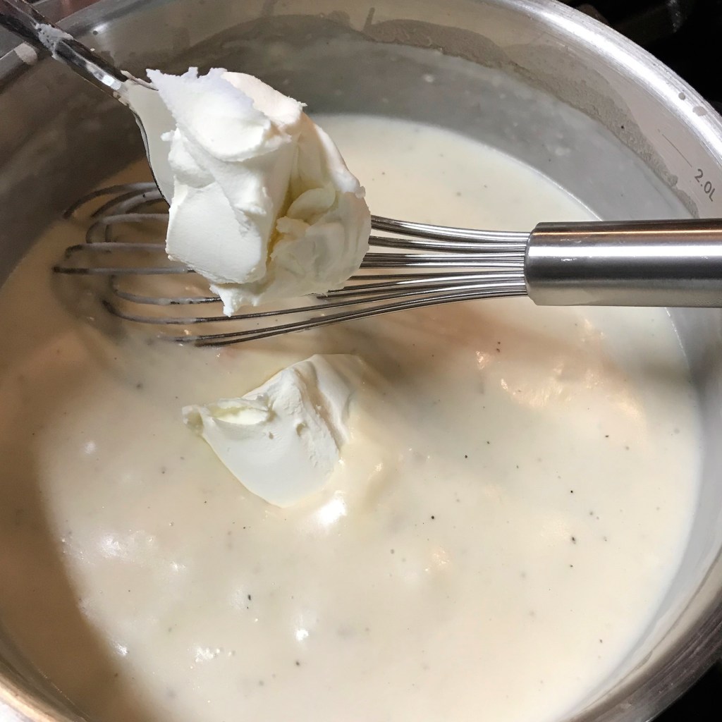 Add cream cheese or mascarpone and whisk until smooth. This will provide a good base for the rest of the cheese sauce.