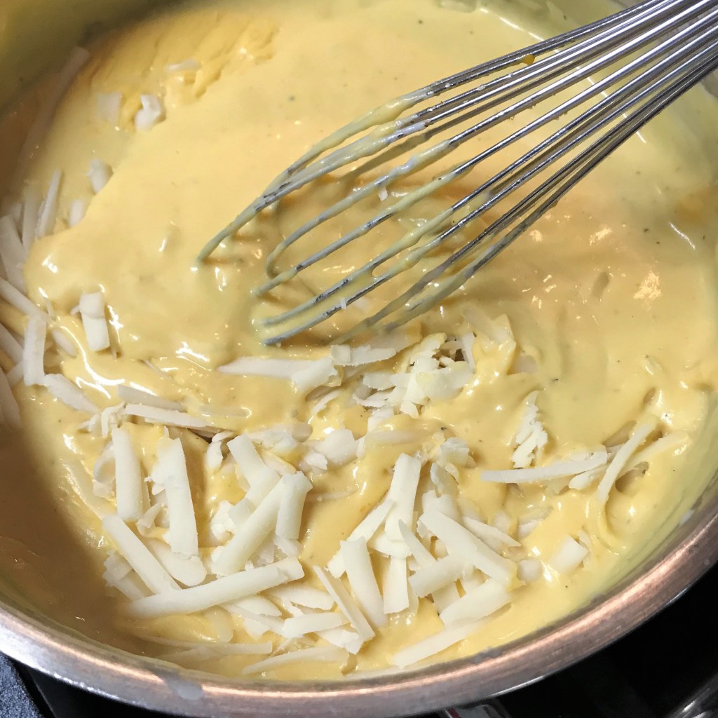 Blend in the shredded cheeses, a little at a time, and whisk until smooth.