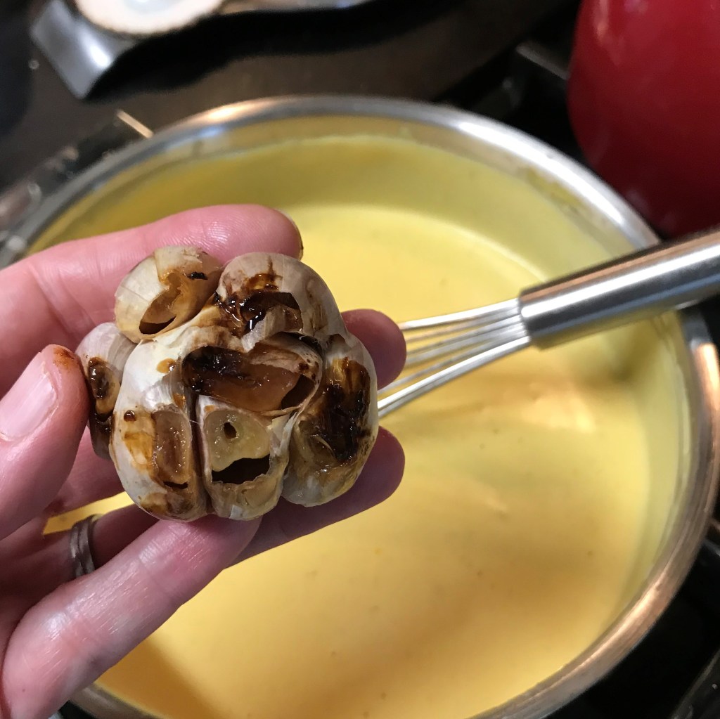 The caramelized roasted garlic will add another level of savory depth to my cheese sauce.