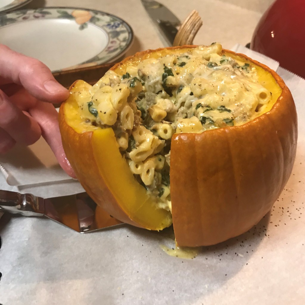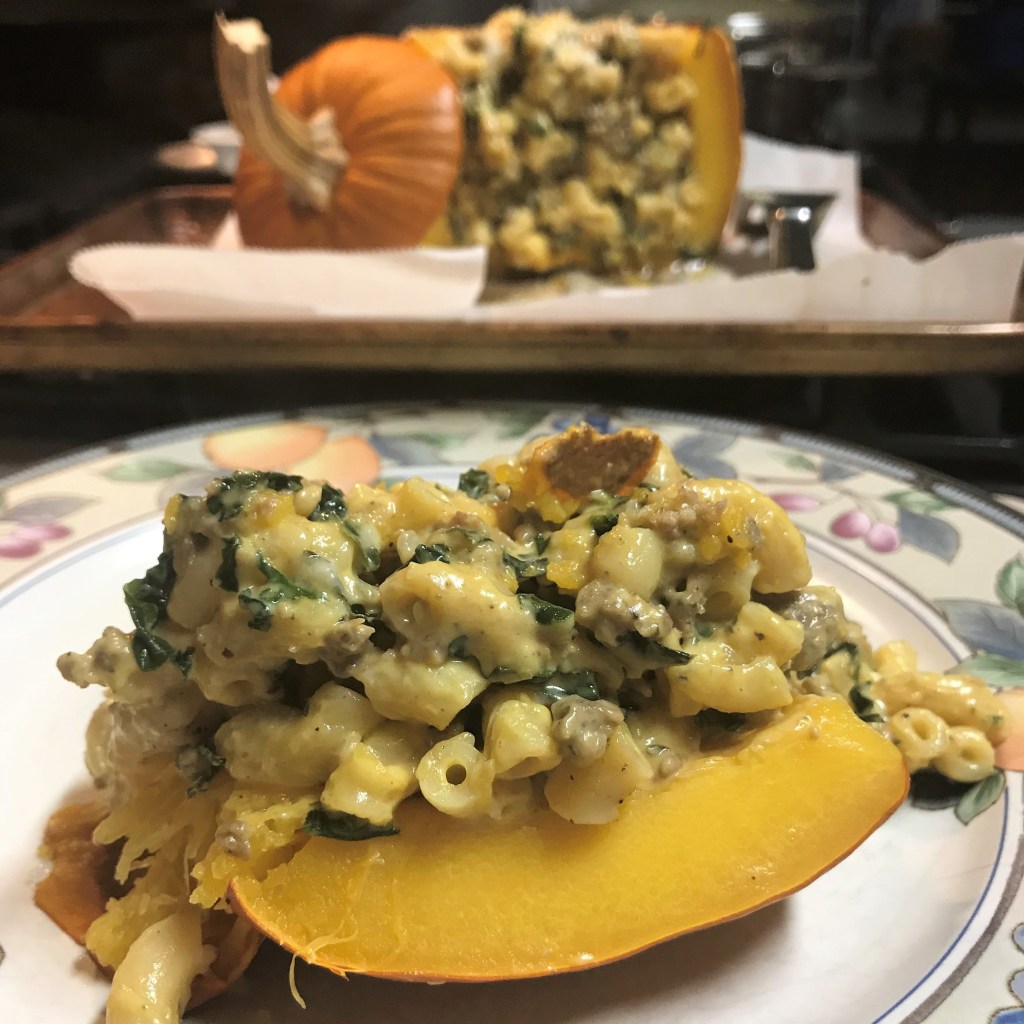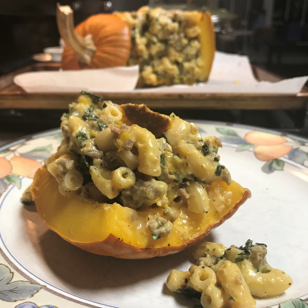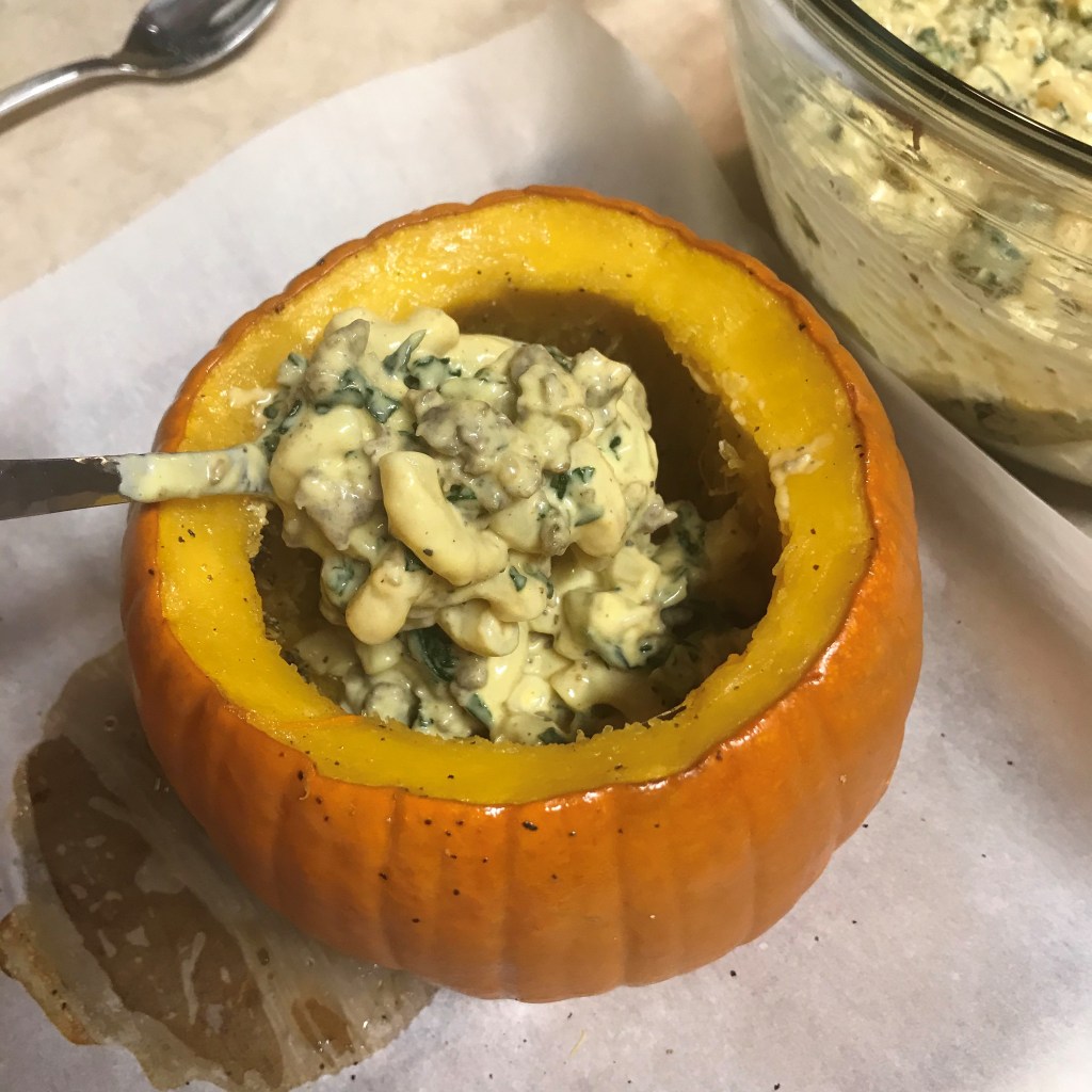 From here, the assembly was a cinch. I cooked up my elbow macaroni to al dente stage, which is just shy of done, and still a little resistance to the bite. Thankfully, this pasta came out perfect! Fold in all of the creamy cheese sauce (even if it seems like too much), and then fold in the sausage mixture. I spooned as much of the mac and cheese as would fit inside the roasted pumpkin, and the rest went into a casserole dish for another meal. How much do you wanna bet I end up putting the leftovers in the waffle iron?