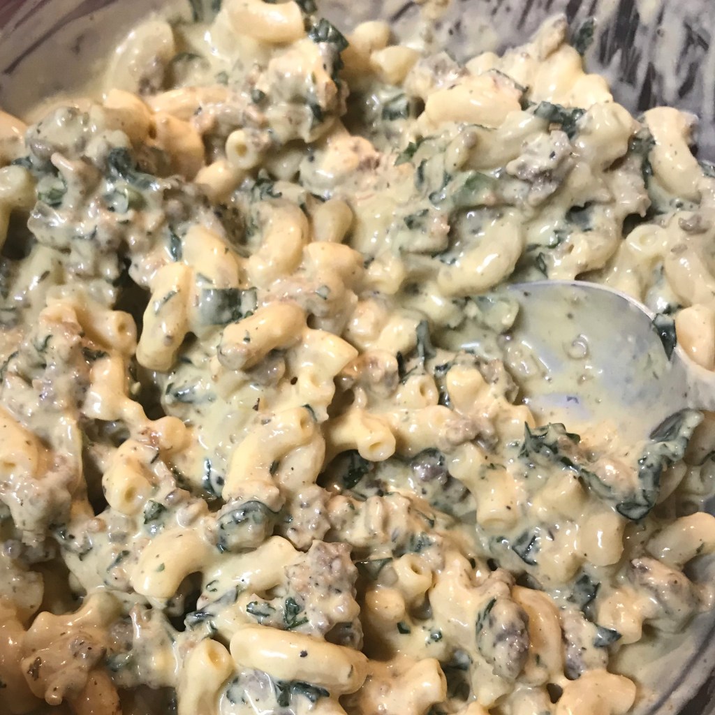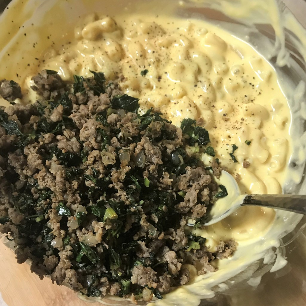 Fold the sausage mixture into the ultra creamy mac and cheese.