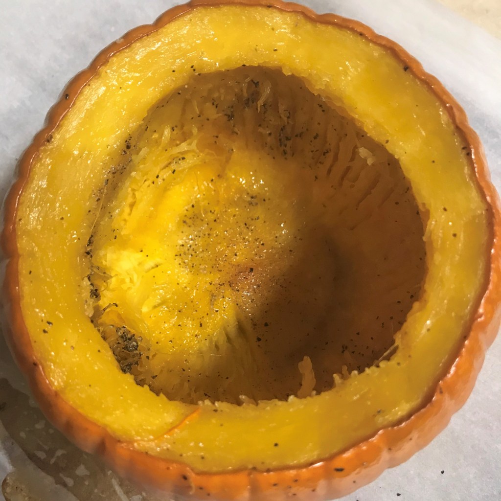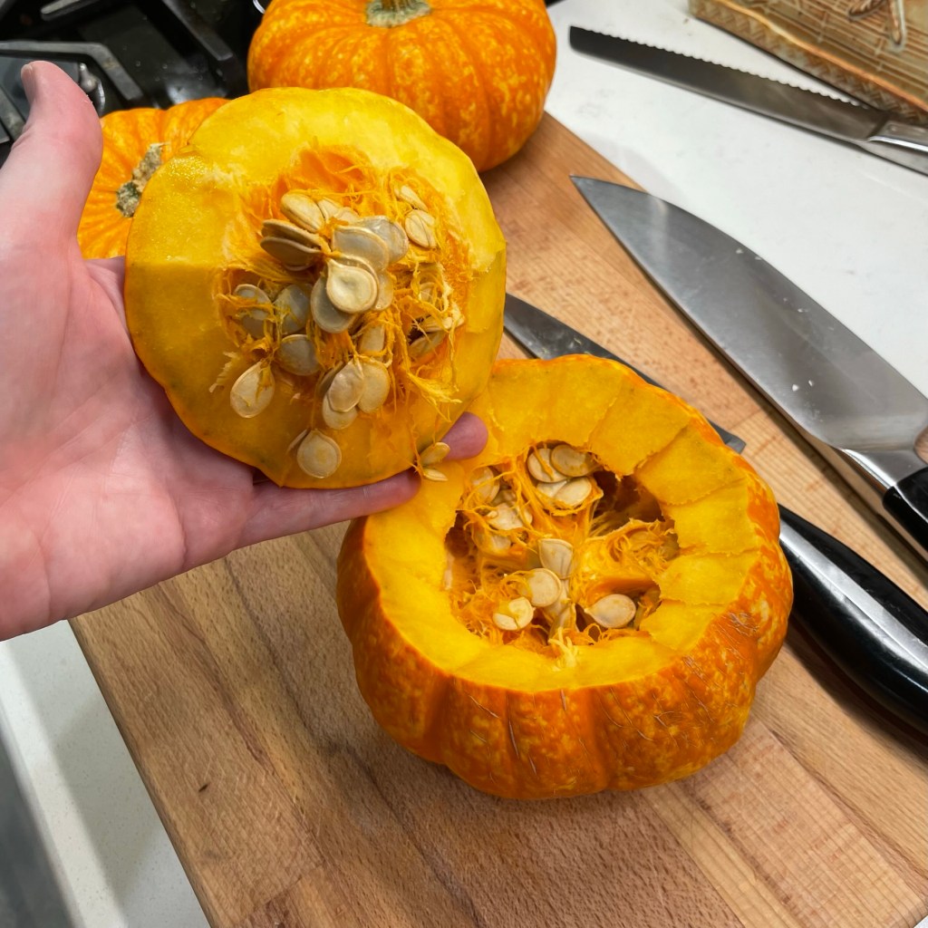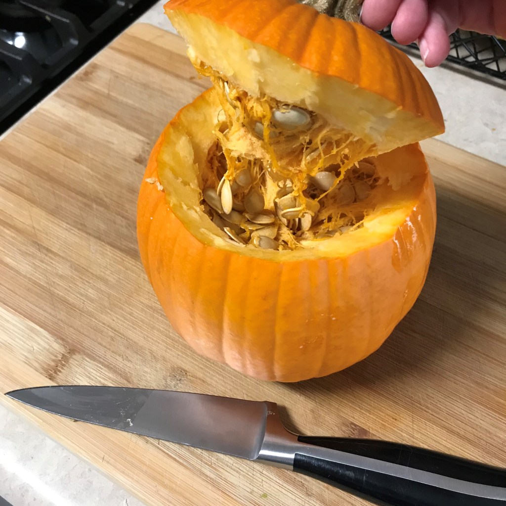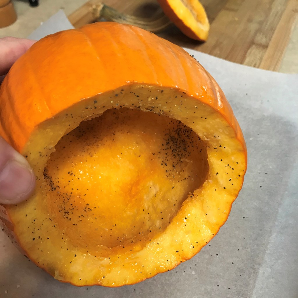 First, I prepped the pumpkin for roasting, which was pretty simple. I followed the same steps as when making roast acorn squash.