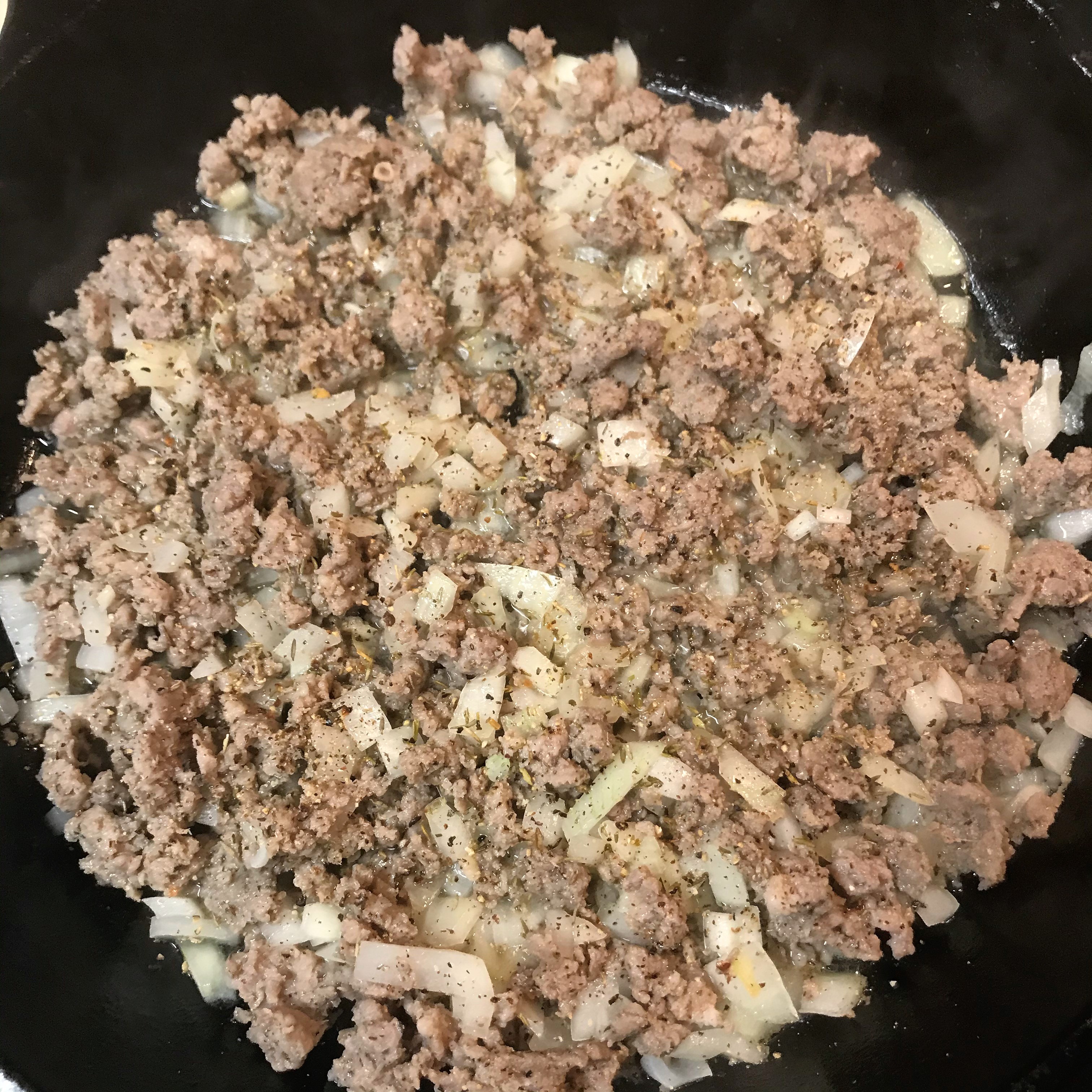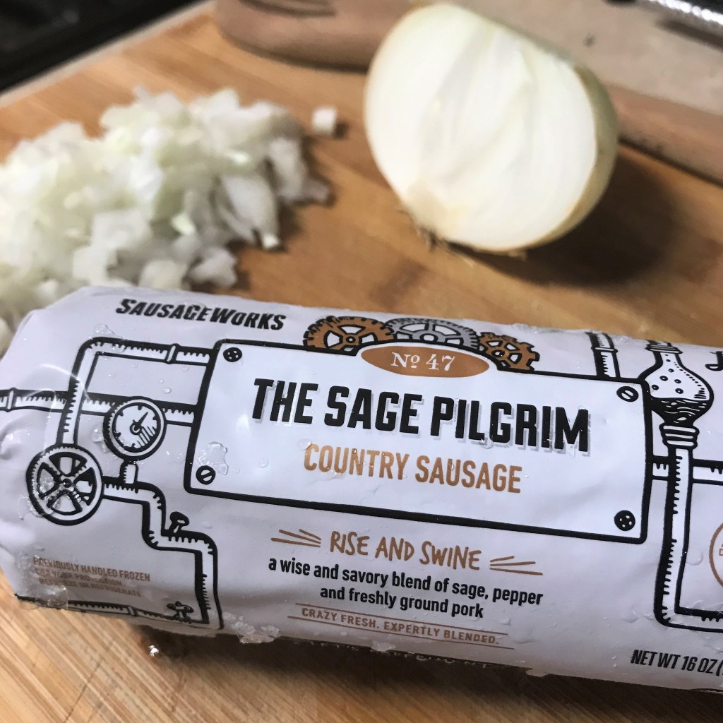 I seasoned the sausage and onion mixture with a few shakes of poultry seasoning, salt and freshly ground black pepper.