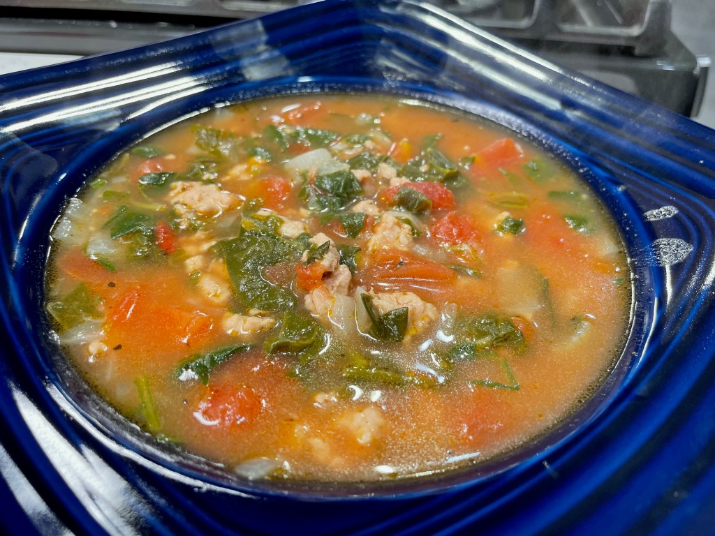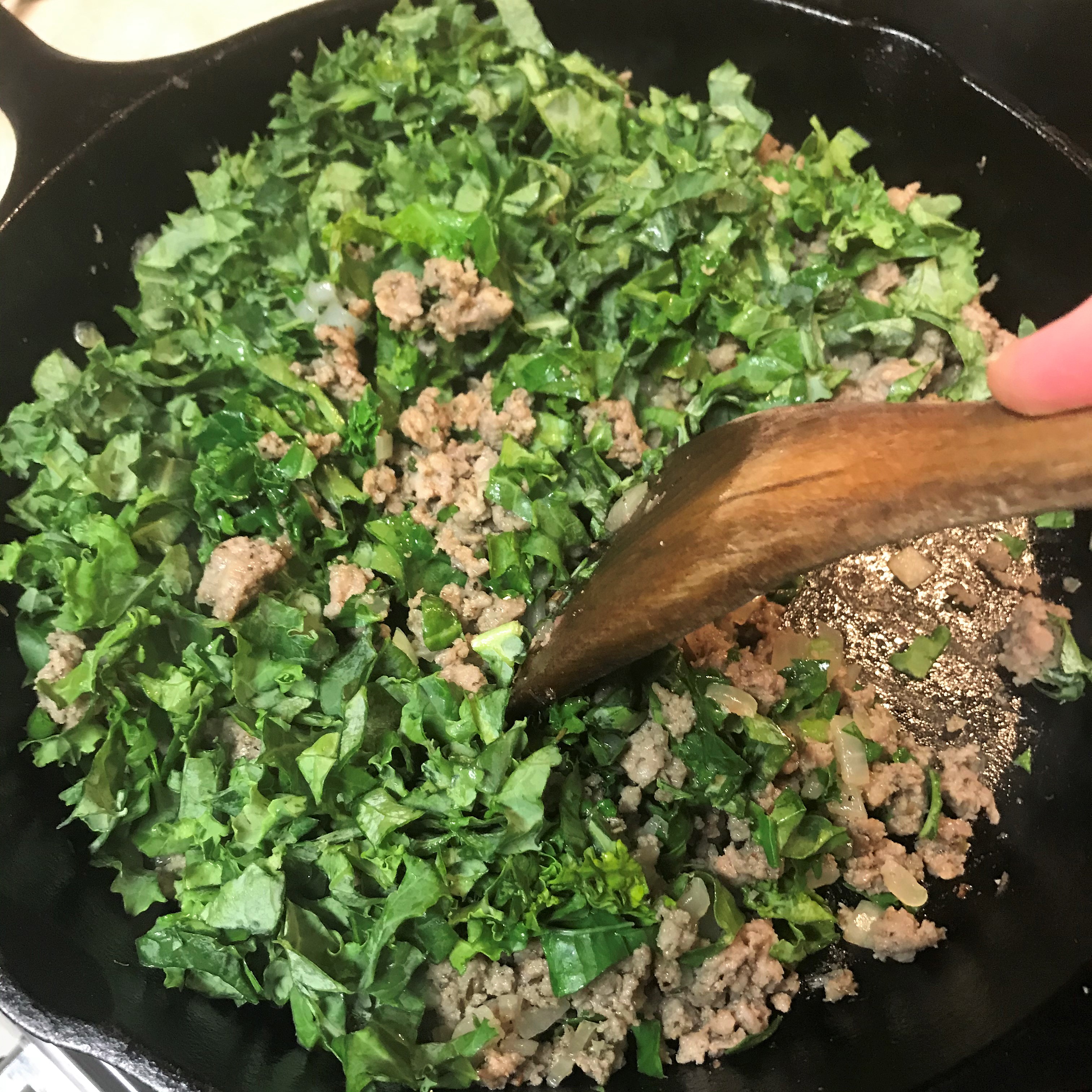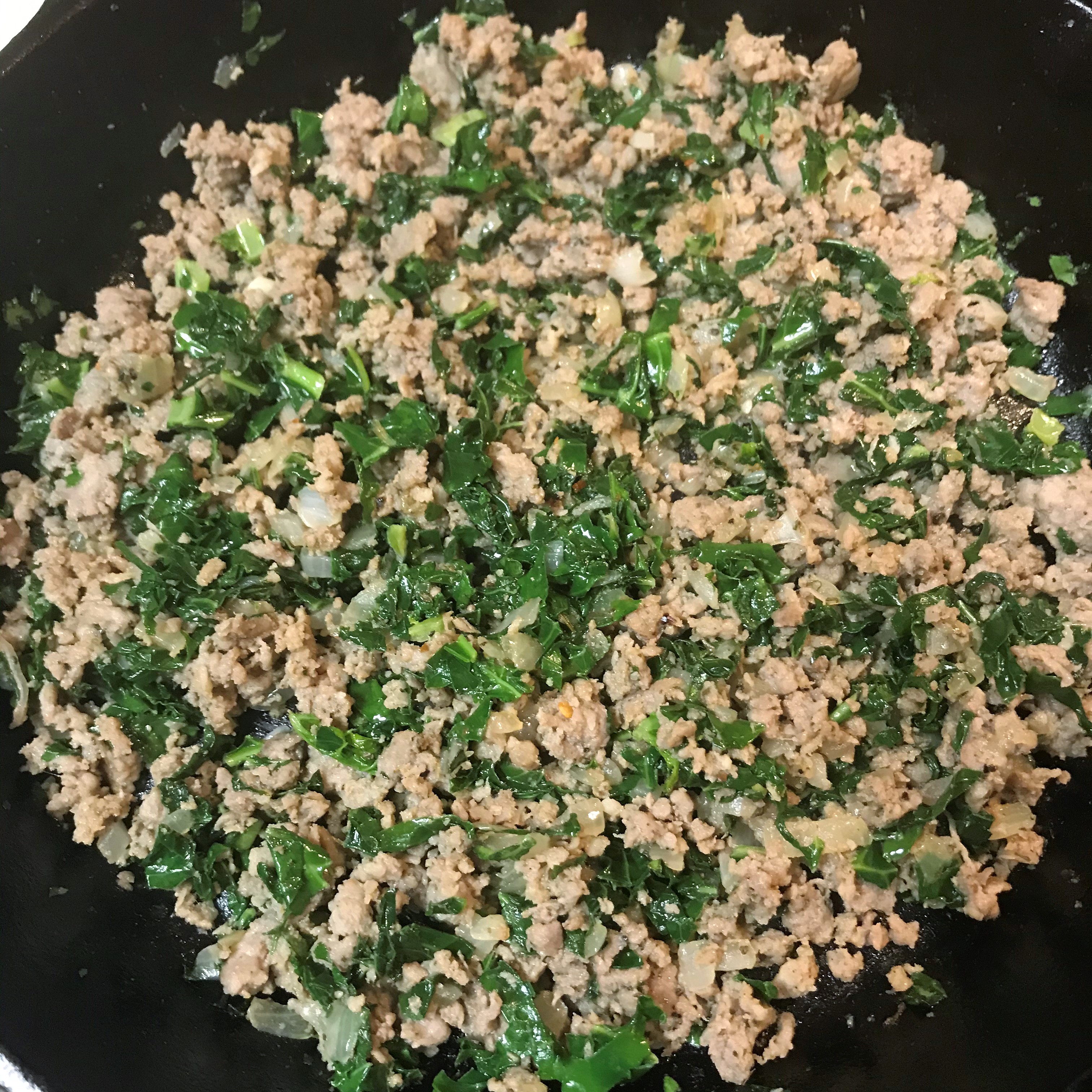 Moving along to the sausage, and this part was easy! I browned the sausage in a skillet, using a little vegetable broth to assist with breaking up the larger pieces. I added the chopped onion and then the kale, and cooked until the onions were tender and the kale was wilted, but still bright green. It smelled amazing in my kitchen!