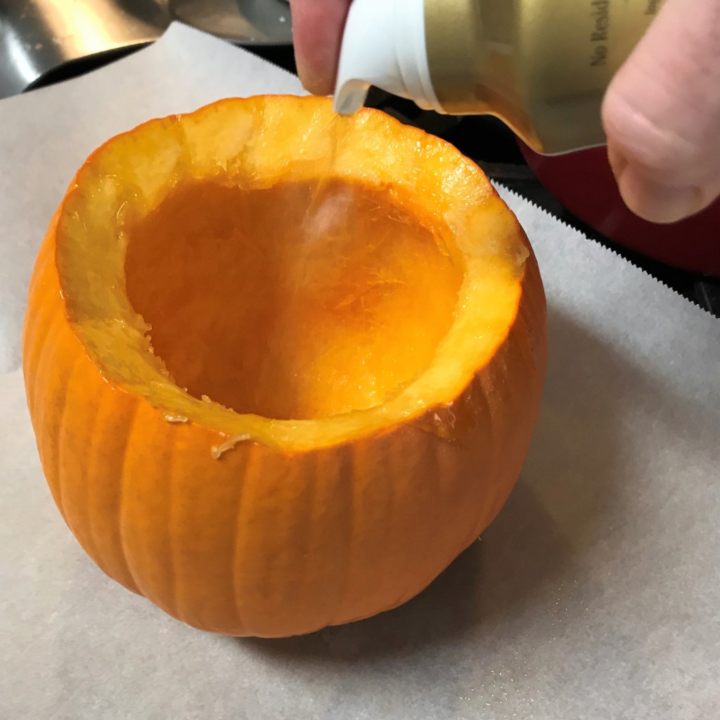 If using canned pumpkin puree, skip to Step 3. If roasting the pumpkins, pre-heat oven to 375° F, with rack in center position. Spray or brush a small amount of olive oil inside the pumpkins and sprinkle the flesh with salt and pepper. Replace the tops, capping the stems with a piece of foil to prevent burning them.