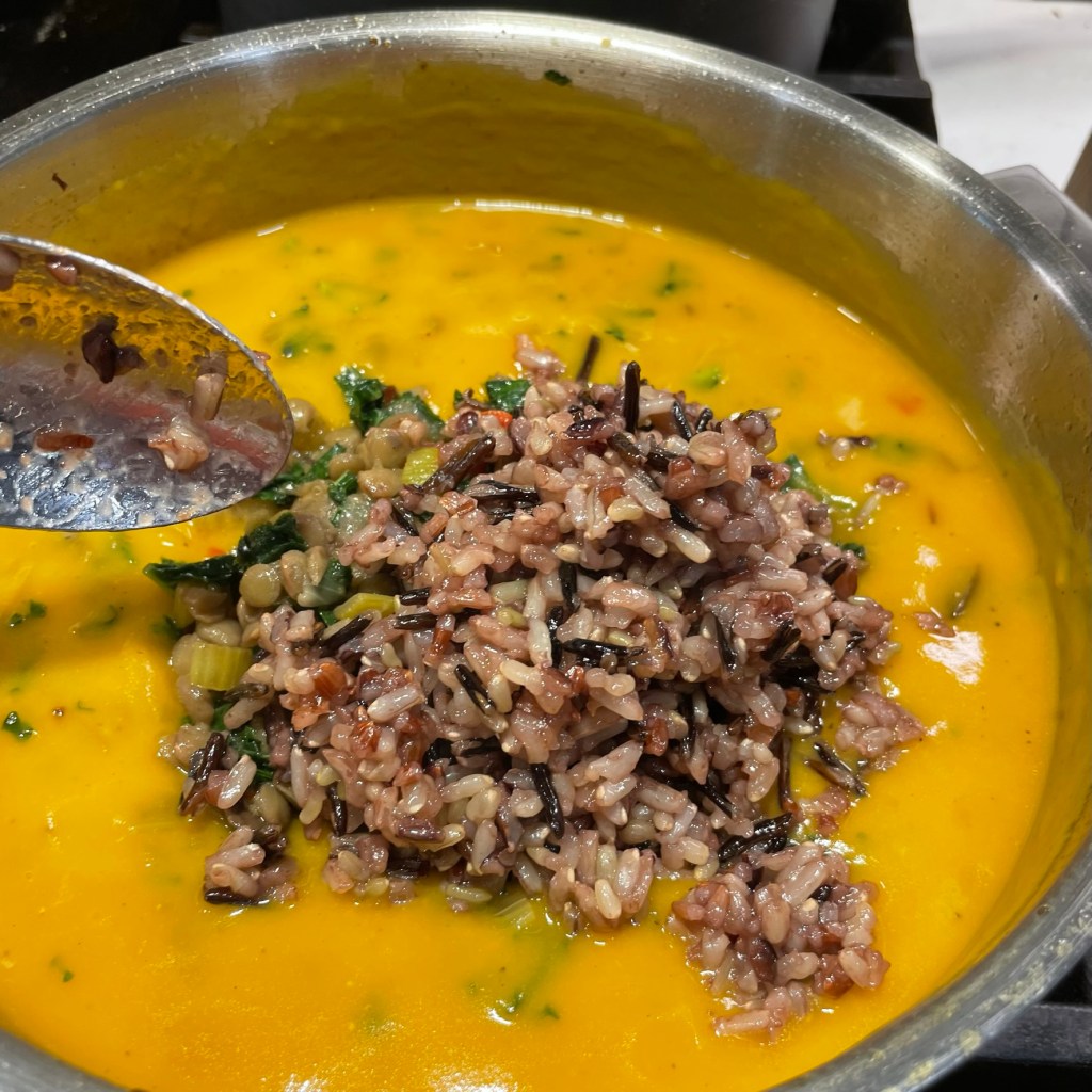 There are three main components of this dish: roasted pumpkin (which did double duty as a serving vessel), creamy pumpkin bisque (without actual cream, to keep it vegan) and a mixture of cooked lentils and rice with sautéed mushrooms and aromatics.