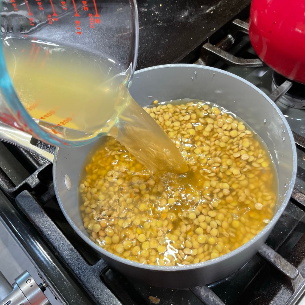 I used dried brown lentils for this dish, and cooked them in veggie broth for extra flavor. To save time, purchase lentils already cooked, such as canned, or those sold by Trader Joe’s.