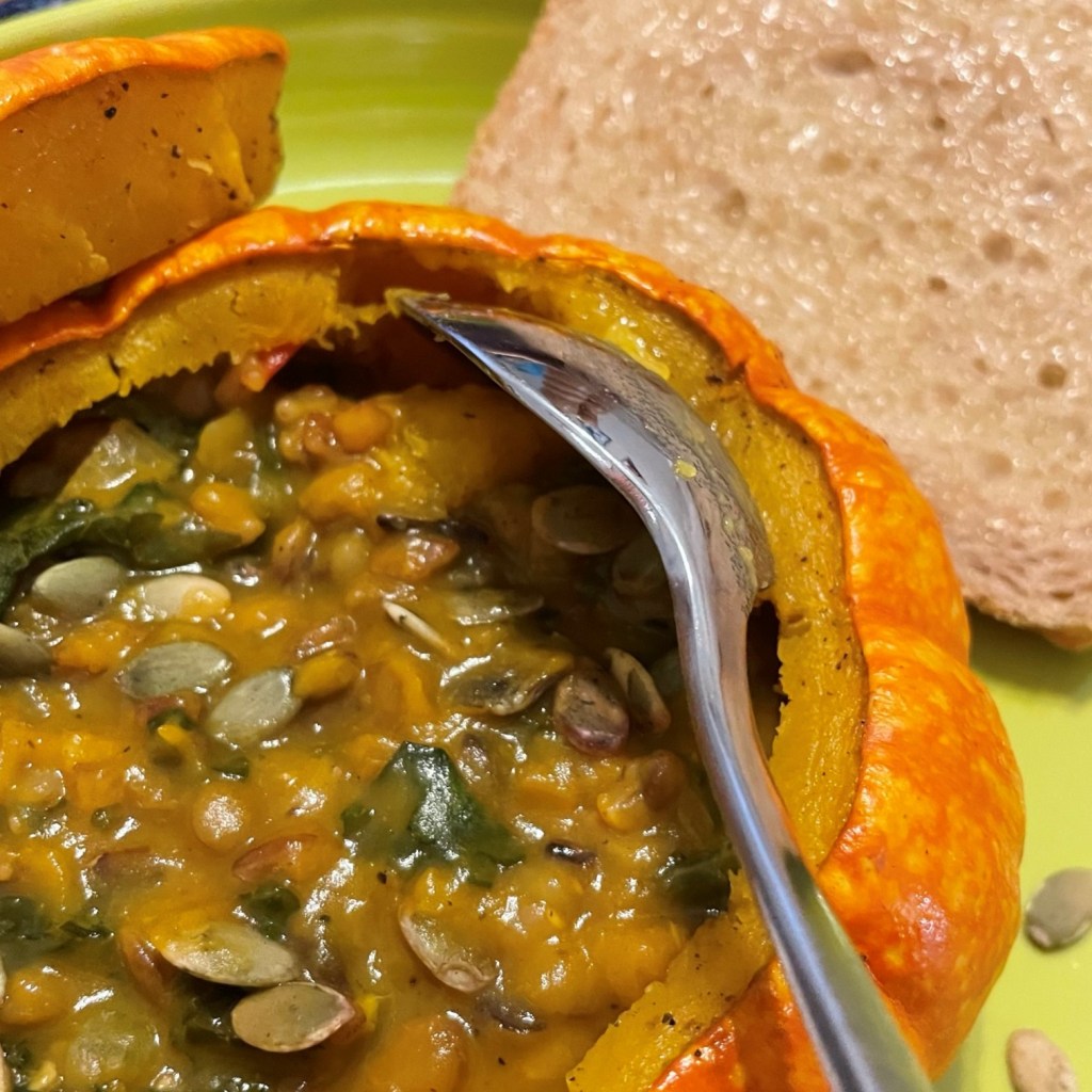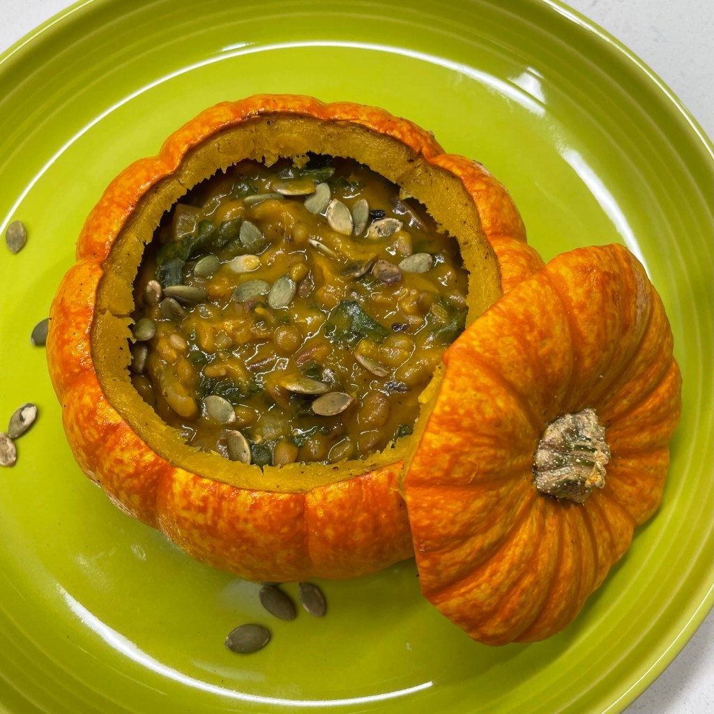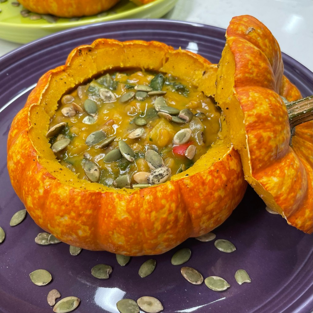 If the pumpkin bowls have cooled completely, slide them into a warm oven on a cookie sheet for about 15 minutes. Ladle the pumpkin-lentil stew into the bowls, sprinkle with roasted pepitas and serve.