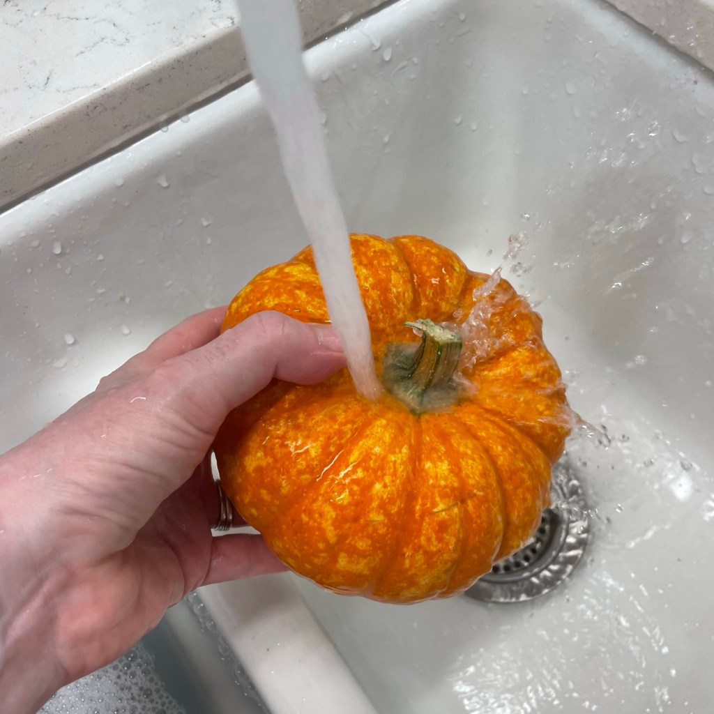 Wash the pumpkins first, then clean them out and roast until they’re tender enough to scoop.