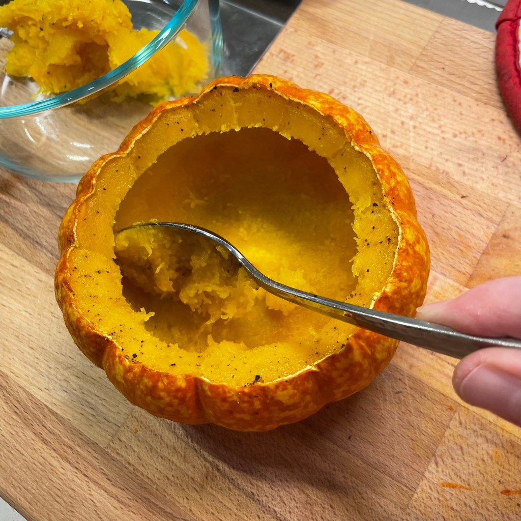 The roasted pumpkin is still slightly firm, but easily scraped inside with a fork. I let it cool while I prepped the filling ingredients.