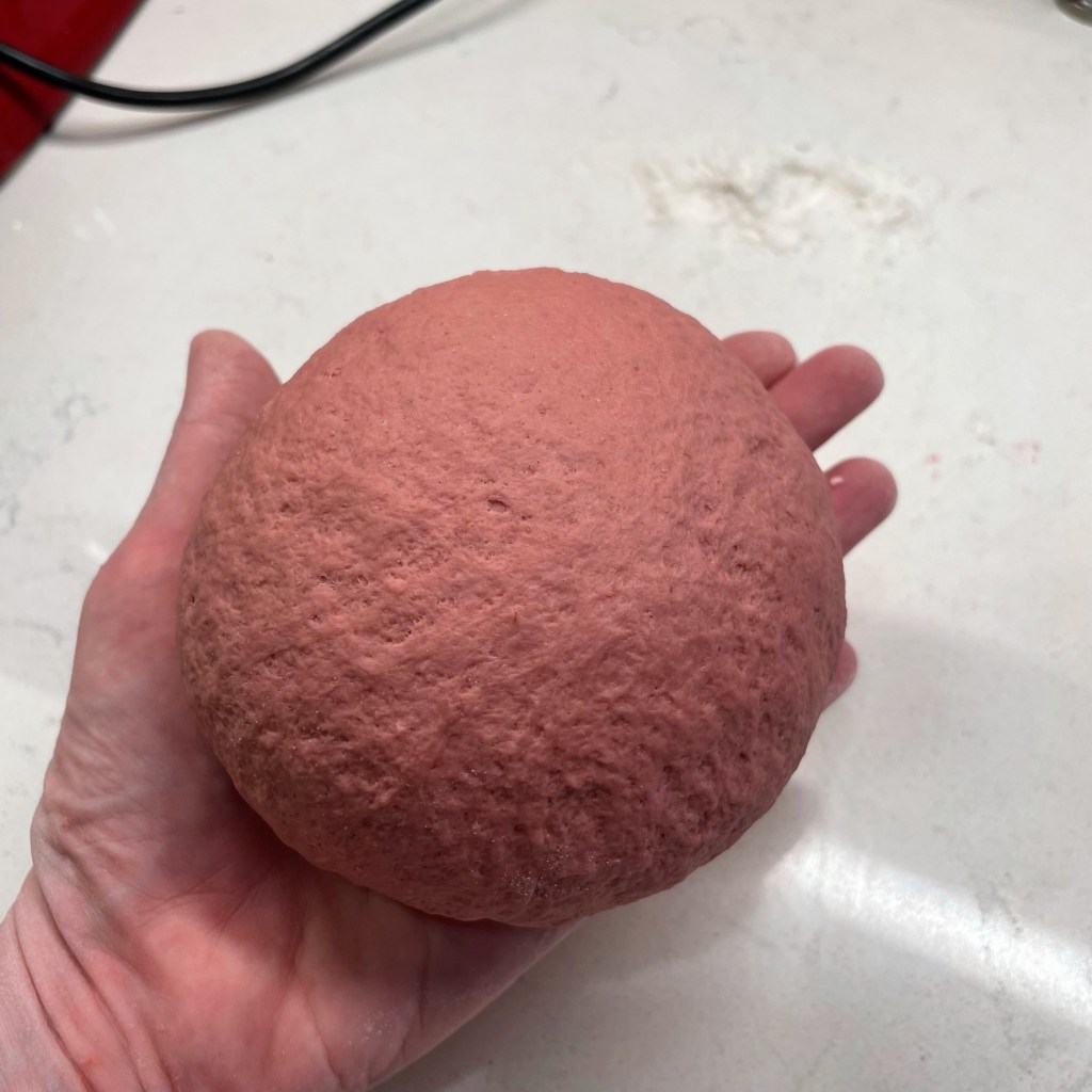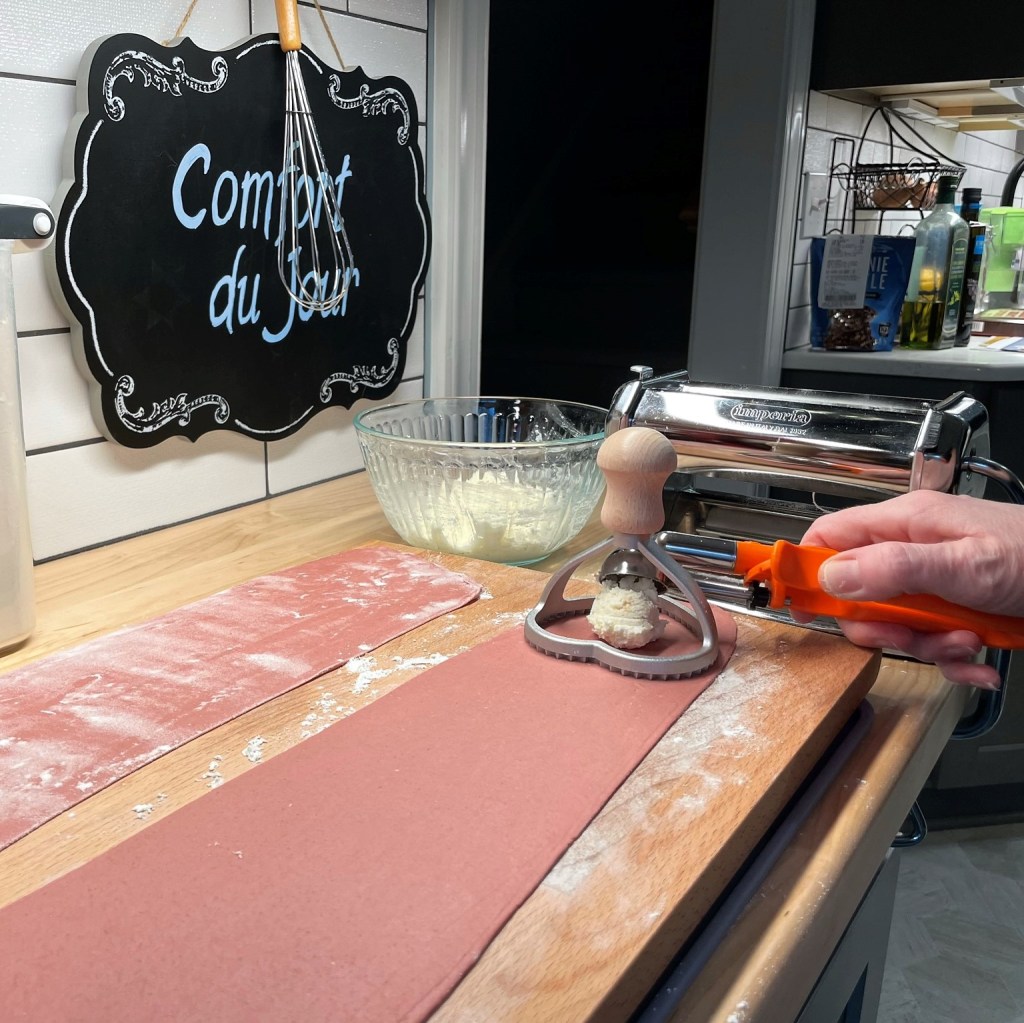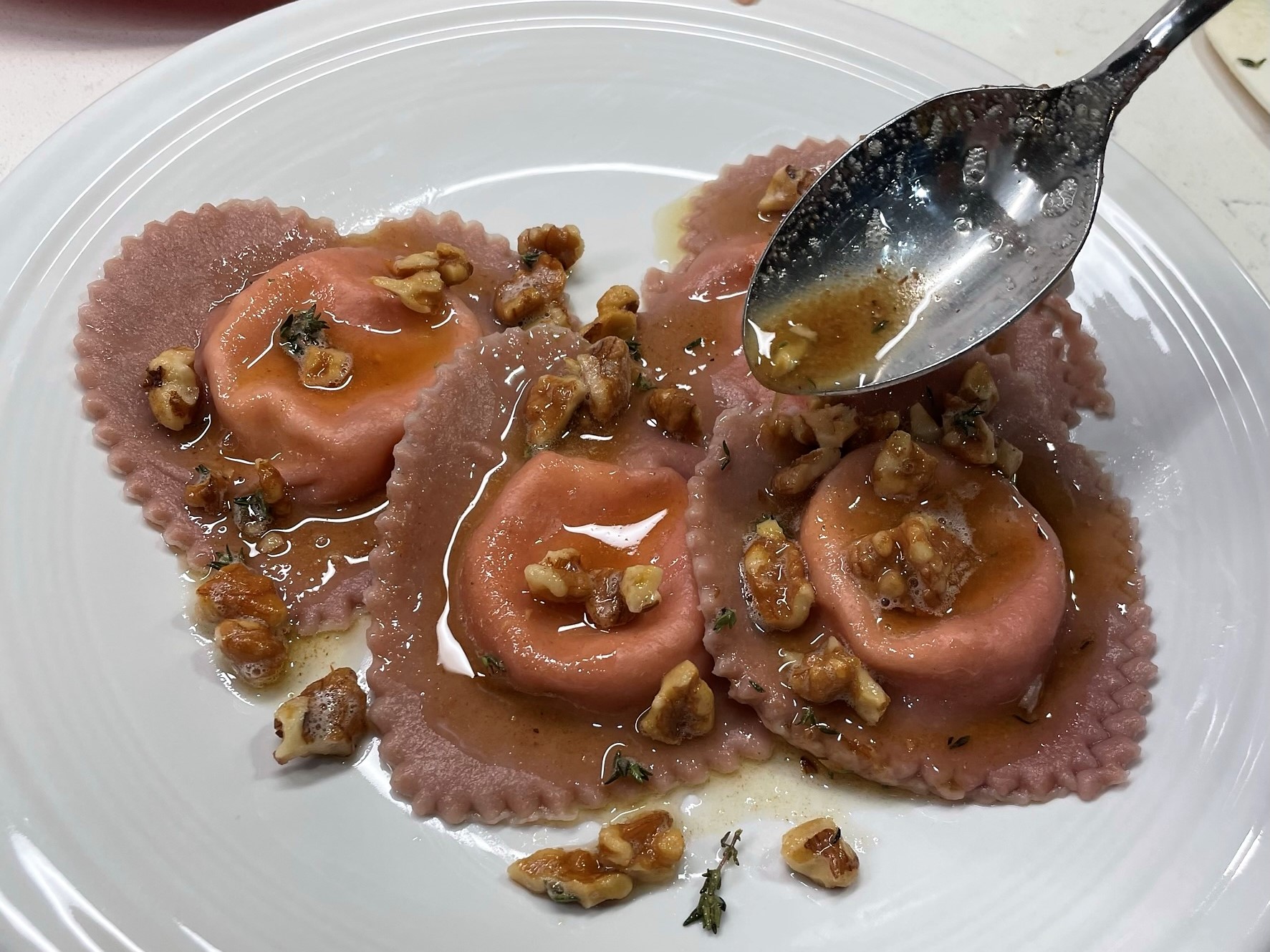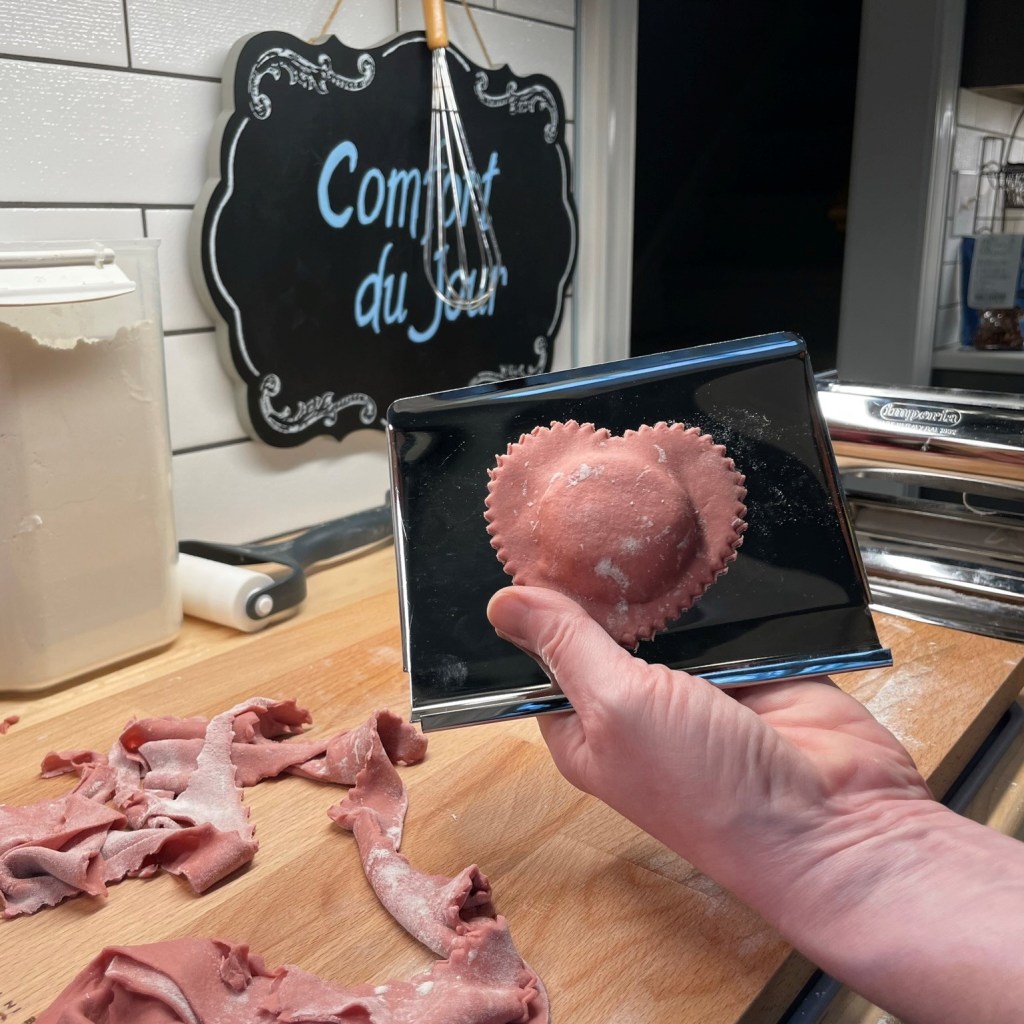 You can see that my pasta dough, which was made with roasted beets, has a soft pink color— not the bright magenta hue that Linda makes. I realized too late that Linda uses frozen pureed beets for her pretty pasta. I love that vibrant color she achieves, but you know what? My soft pink, heart-shaped pasta is still perfectly appropriate for Valentine’s Day, and the beets in the dough are good for cardiovascular health, so there’s that. You hardly taste the flavor of the beets, but the nutritional benefit is still in there.